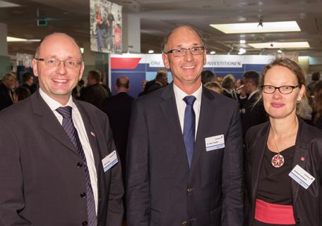 Die Wirtschaftsförderungsgesellschaften aus Hamburg, Schleswig-Holstein und Mecklenburg-Vorpommern präsentierten ihre Arbeit bei der Martinsgans. Auch Mario Kokowsky, Geschäftsführer Finanzen und Marketing der DEN GmbH, informiert sich hier bei Rolf Kammann (l.) und Karl Kuba (r.) von der Wirtschaftsförderung Vorpommern.