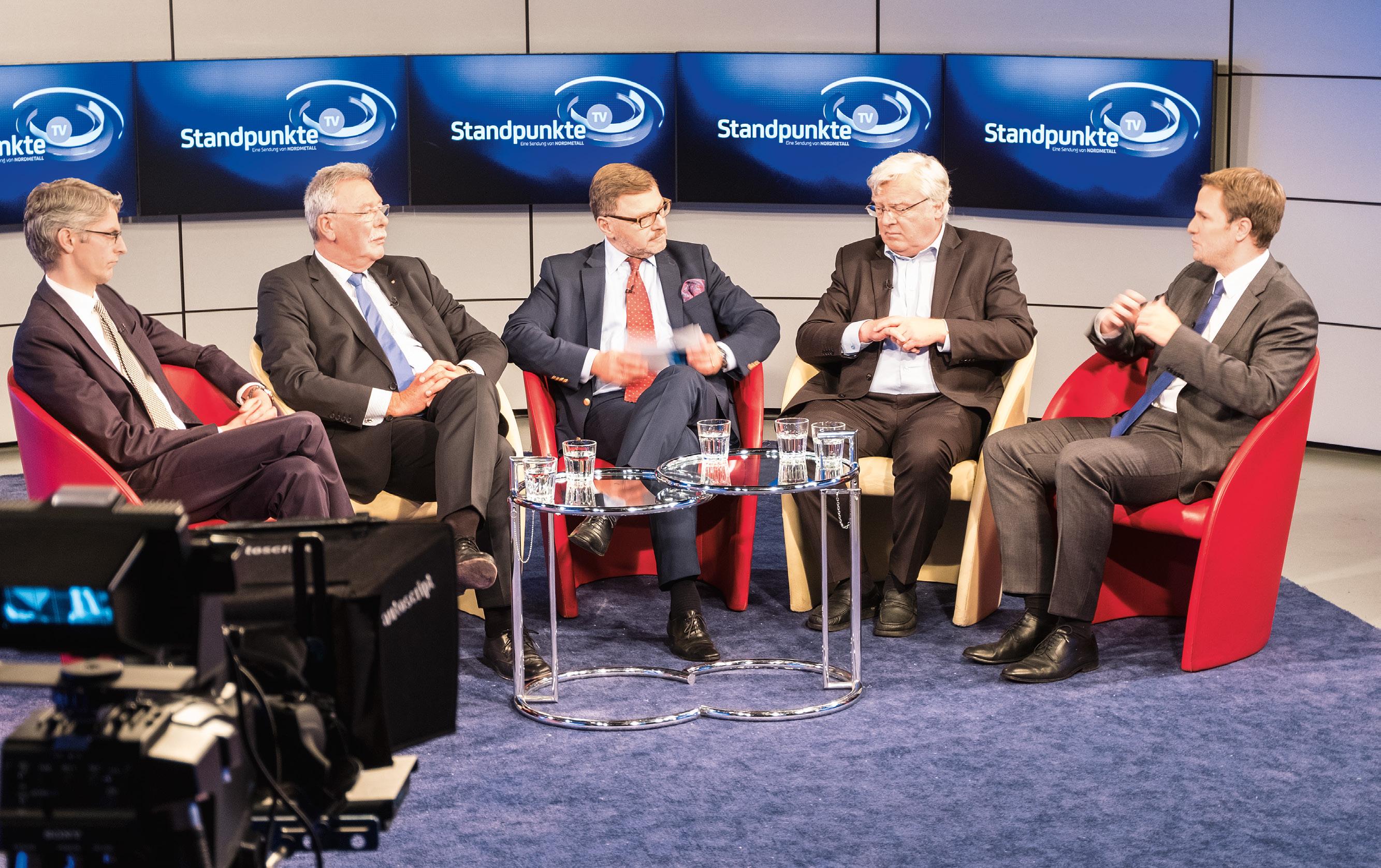 Im Fernsehstudio bei Hamburg1: der Hamburger SPD-Bürgerschaftsabgeordnete Hansjörg Schmidt, NORDMETALL-Präsident Thomas Lambusch, Standpunkte-Chefredakteur Alexander Luckow, Hamburgs FAZ-Wirtschaftskorrespondent Carsten Germis und Schleswig-Holsteins FDP-Fraktionsvize Christopher Voigt (v.l.n.r.).