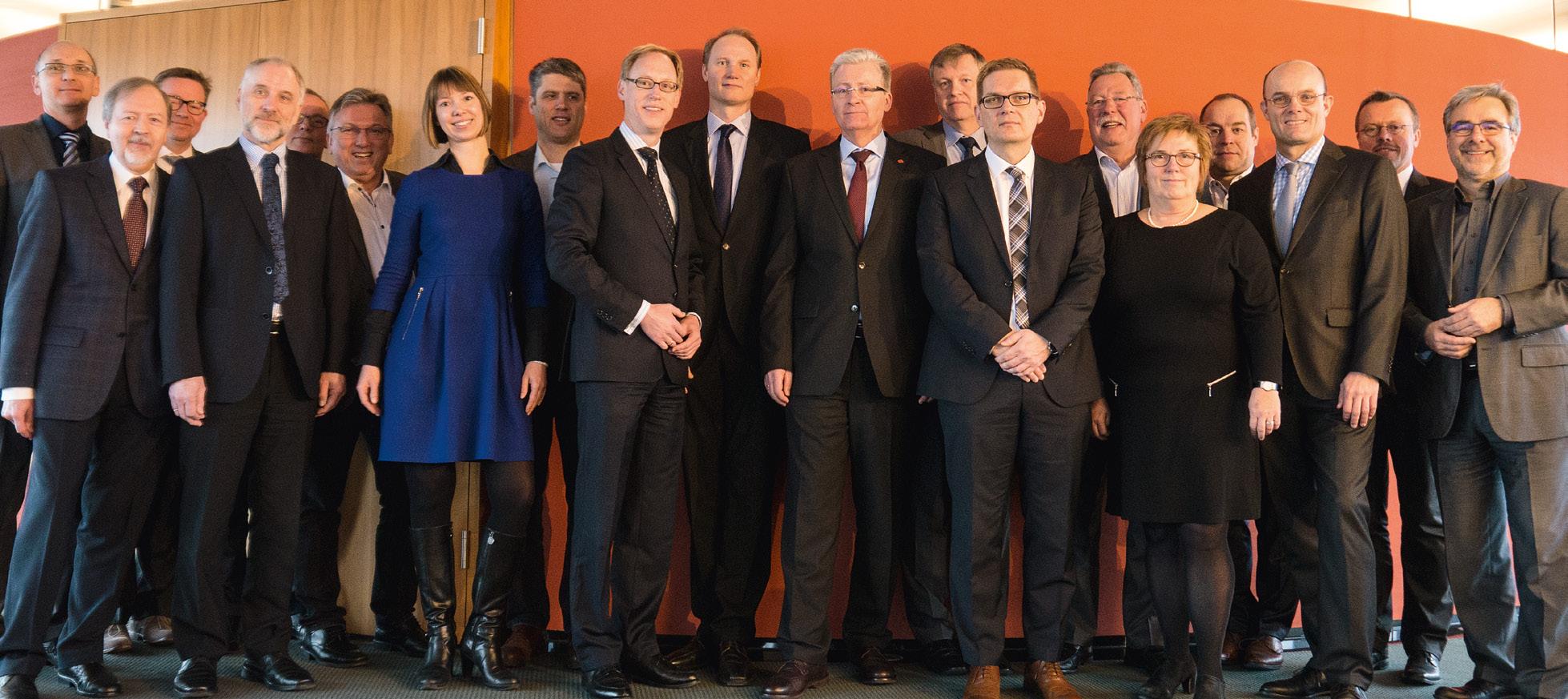 Gedränge vor der Rotunde des Hamburger Hauses der Wirtschaft Ende Januar: Vorstand und tarifpolitischer Ausschuss von NORDMETALL tagten in großer Besetzung gemeinsam, um die Agenda für das Jahr 2017 zu diskutieren. Unter Leitung von NORDMETALL-Präsident Thomas Lambusch (6.v.r.) wurden unter anderem