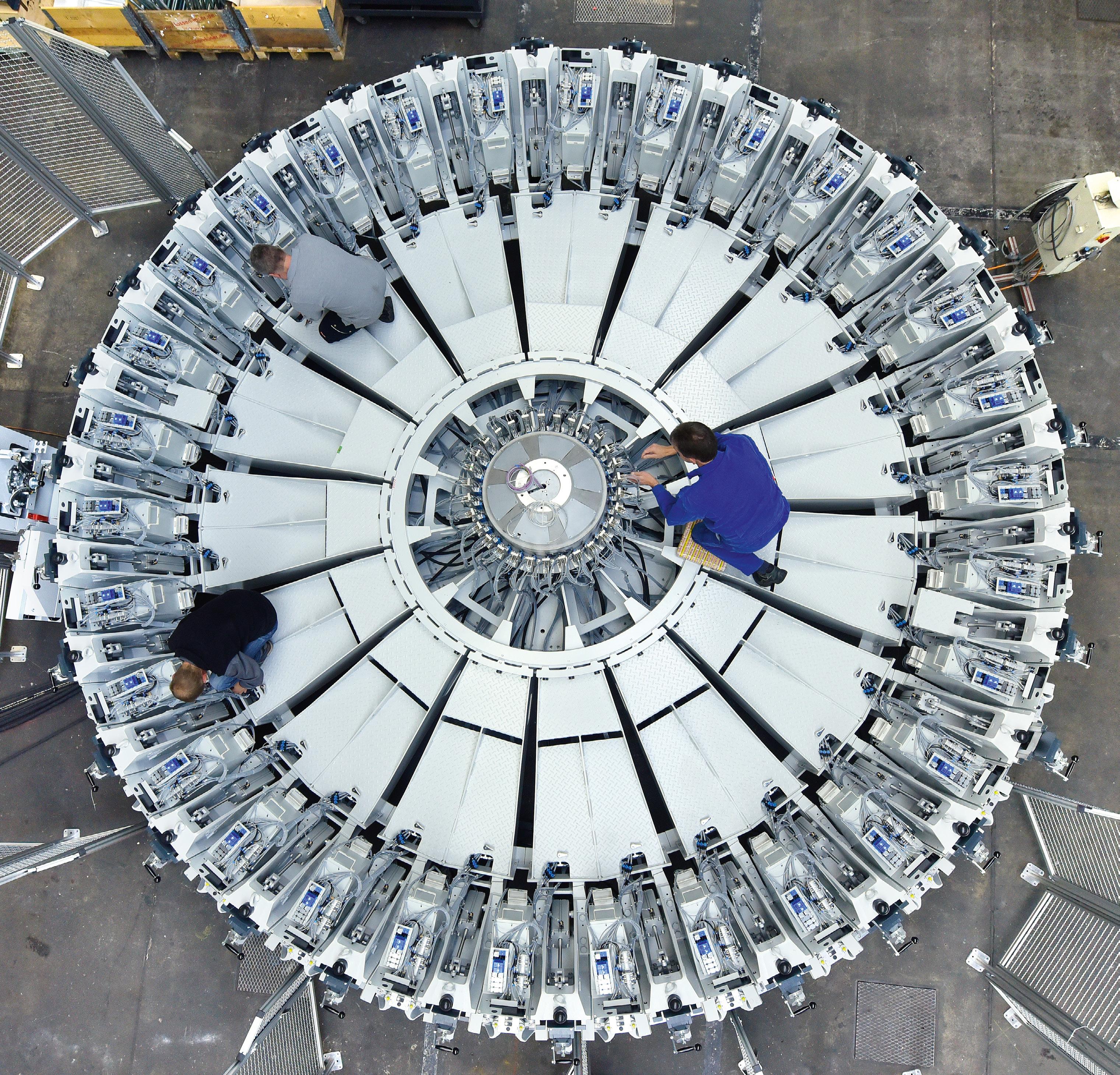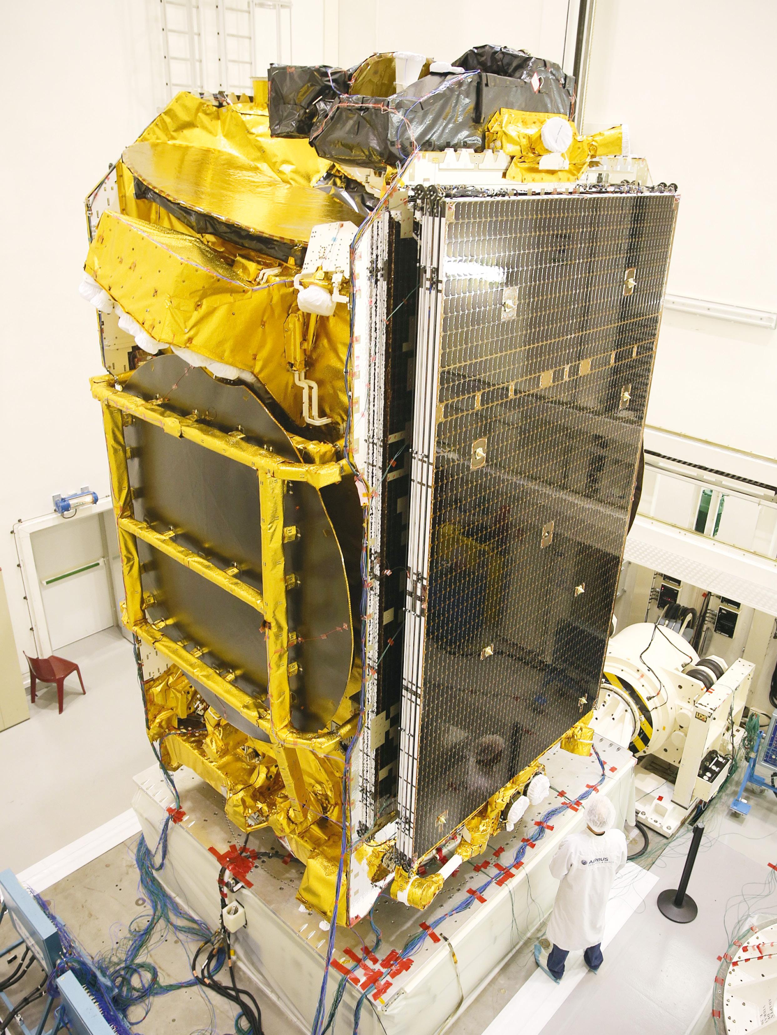 Elektroantrieb auch im All. Der EUTELSAT 172B ist der erste in Europa gebaute vollelektrische Hochleistungs-Telekommunikationssatellit. Er nutzt für die anfängliche Bahnanhebung im Orbit und alle weiteren Manöver im Zielorbit ausschließlich einen elektrischen Antrieb. Auf dem Bild wird er in der Satelliten-Montageeinrichtung bei Airbus letzten Tests unterzogen. Im April soll er von Kourou (FranzösischGuayana) an Bord einer Ariane 5 ins All starten. Der 172B wird unter anderem Flugpassagieren über dem Pazifik Breitbandinternet bieten.