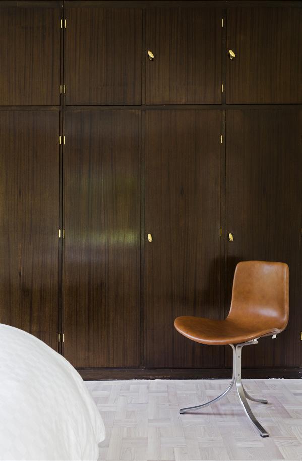 For nogle årtier siden ville mange sikkert have fundet pensel og hvid maling frem ved synet af disse mørke skabe. Men det gjorde arkitekt Anders Barslund og familien heldigvis ikke i dette hus fra 1920’erne. I stedet havde de blik for, at skabene er en smuk original detalje i huset, og at snedkerarbejdet er i en kvalitet, man sjældent kan få i dag – medmindre man betaler rigtig mange penge! De bevarede derfor skabene og satte dem i stand, så det mørke træ i dag kommer til sin ret. Lågerne er i mahogni og er behandlet med shellak. Lakken fremhæver den mørke glød og åretegninger i træet og giver samtidig en flot blank overflade. Typisk vil låger eller skuffer i gamle skabe binde. Hvis det er tilfældet, kan man få en snedker til at rette skabet op og smøre hængslerne.