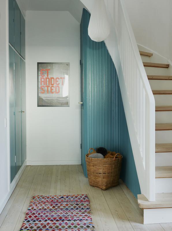 Disse fine paneler fulgte med huset fra 1950’erne. Da familien flyttede ind og skulle i gang med at ombygge med hjælp fra arkitekt Jørgen Dahlgaard, var malingen skallet af flere steder, og de snedkererede paneler trængte generelt til en kærlig hånd. Det fik de med en omgang slibning, og familien valgte at opfriske den originale turkisblå farve med et nyt lag maling i samme farve. Den klassiske 50’erfarve giver liv og personlighed til entréen.