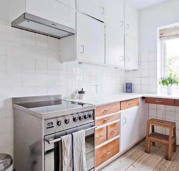Trods mange års brug stod dette køkken stadig smukt og charmerende i et hus fra 1928. Køkkenet var nemlig i gode materialer og vedligeholdt gennem næsten 100 år. Det var dog alt for lille til boligejerens behov, men i stedet for at rive det ned og montere et nyt køkken fik arkitekt Thomas Hjort en snedker til at bygge nogle overskabe i samme stil og efter opmåling af det oprindelige. Køkkenet er et rammekøkken, hvor rammen er hvidmalet, mens de finerede skuffer er behandlet med neutral, farveløs olie. Grebene er i messing og lågerne sprøjtelakeret. Også det nye komfur passer ind i det ældre køkken.