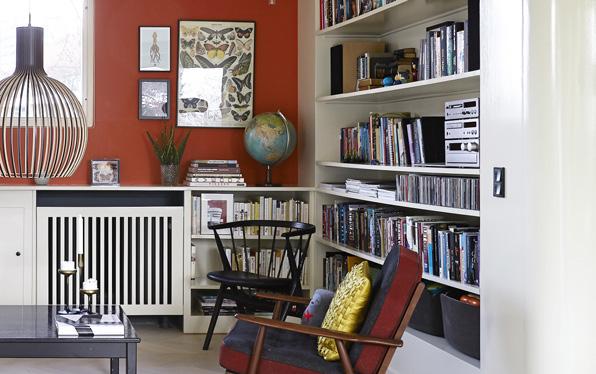 Skabene og radiatorskjuleren i denne stue er originale og står præcis, som da arkitekt Anders Barslund overtog sit velbevarede 1950’erhus. Begge dele er lavet af snedkere til huset, hvorfor Anders Barslund godt vidste, at de skulle bevares. For hvis man vil have udført møblerne i samme kvalitet i dag, vil det koste en formue. Efter en ombygning har det bevarede, indbyggede inventar fået selskab af en ny reolvæg med et rundet hjørne, der leder blikket videre fra det ene rum til det andet.