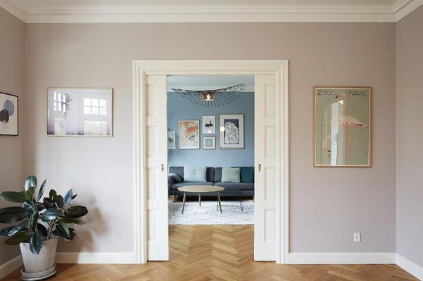 Arkitekt Søren Sarup har stået for restaureringen af denne murermestervilla fra 1929, hvor der blandt mange fine detaljer er denne klassiske skydedør imellem de to stuer en suite. Fremfor at åbne mellem de to stuer eller blænde døren af for at skabe flere værelser har ejerne valgt at beholde de to stuer en suite. Det er en typisk planløsning, der hører til byggeperiodens livsstil og derfor også byggestil.