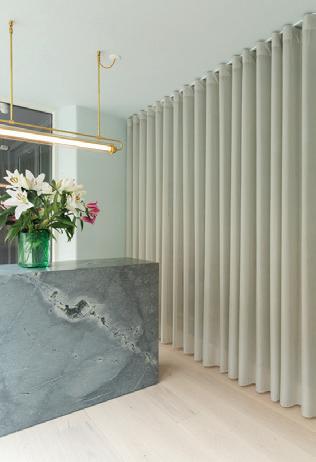 I showroomet kan du se nogle af de eksklusive materialer, NO.BA STUDIO bruger, og det er ikke metervarer, du finder på hylderne: „Mange af mine kunder forelsker sig i en bordplade og siger: 'Den vil jeg gerne have'. Bordpladerne er lavet af naturmateriale, så