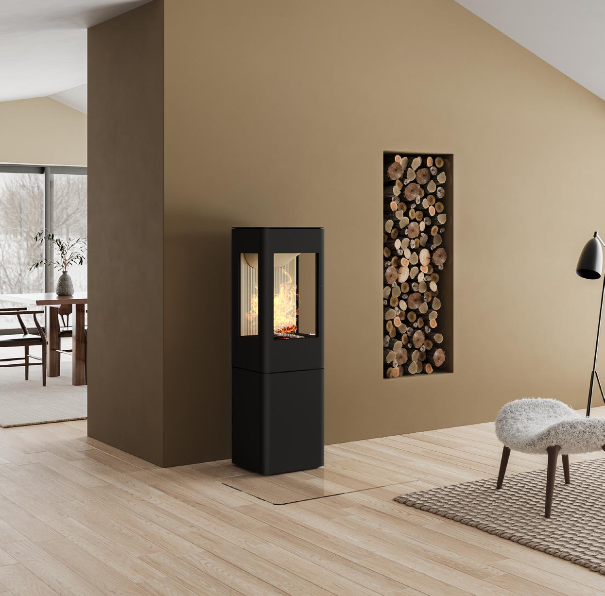 Schlicht und stilvoll – Praha ist eine Kaminanlage, die für viele Wohnsituationen ideal passt. Sie bietet einen dreiseitigen Blick auf die Flammen und die dekorative Holznische sorgt für den einfachen, aber perfekten letzten Schliff. Praha verfügt über einen intergrierten Brandschutz, womit sie direkt an eine Wand aus brennbarem Material gestellt werden kann. Und wenn Sie eine raumhohe Kaminanlage wünschen, können Sie ein zusätzliche Oberteil ergänzen.