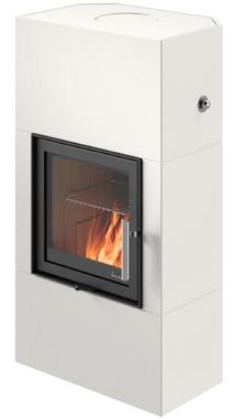 Der Kamin ist mit funktionellen Finessen ausgestattet wie die selbstschließende Tür mit Stoppfunktion. Durch die hinterlüftete Brandschutzwand kann er direkt an einer Wand aus brennbarem Material montiert werden.