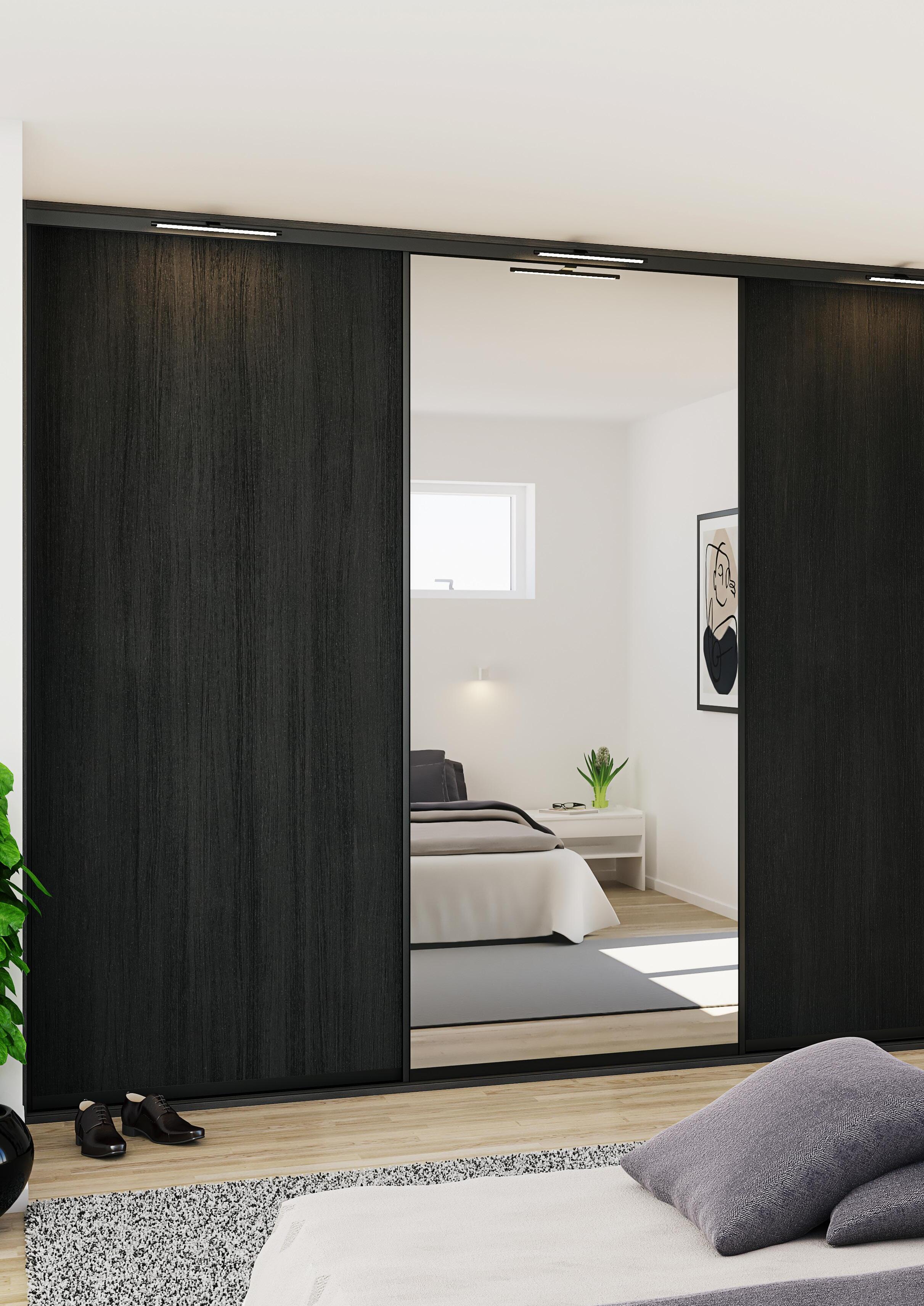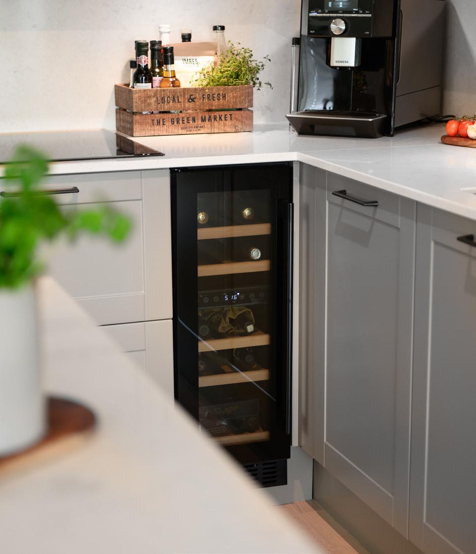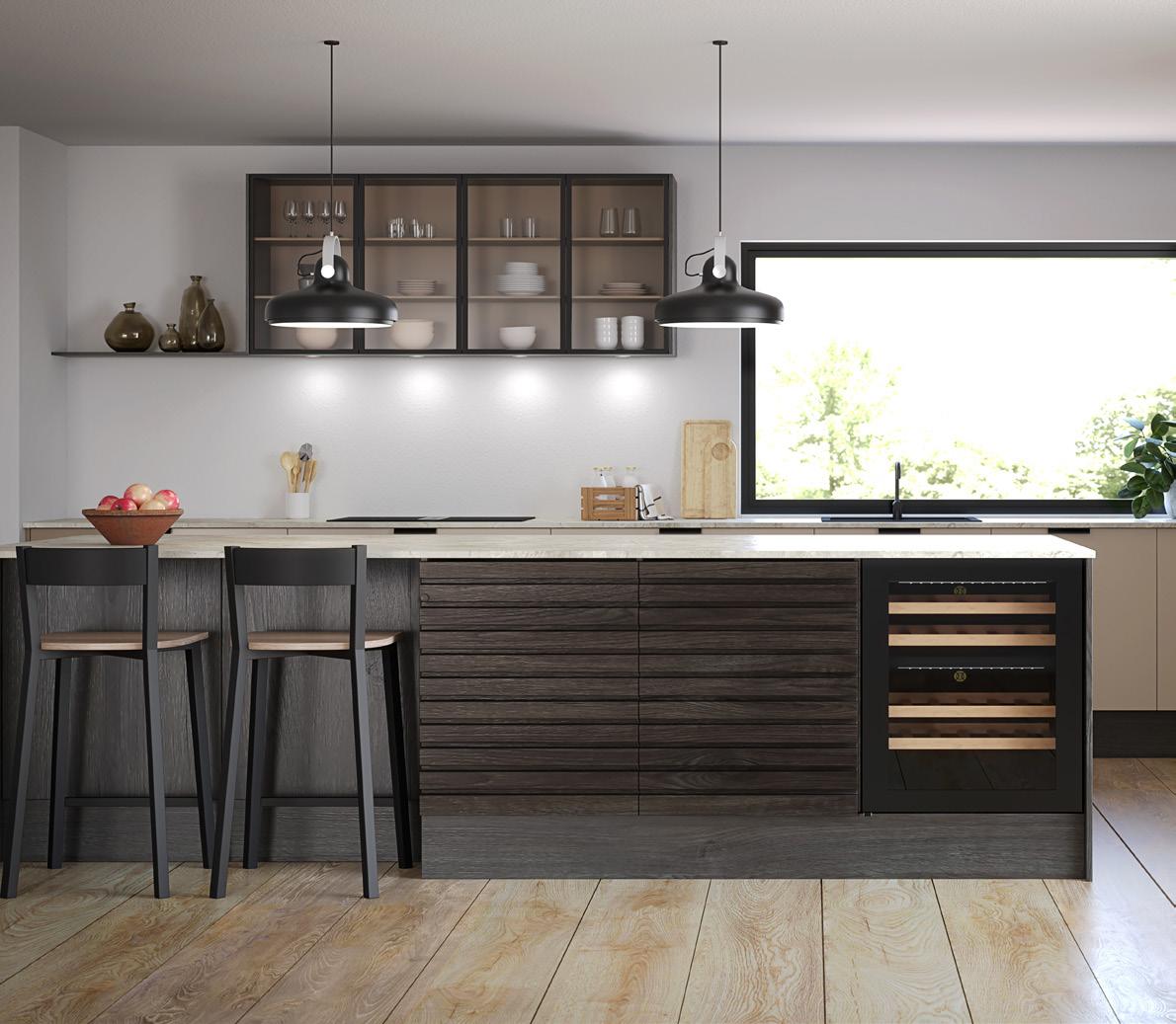 Selv om modellen ikke har egne vitrinedører eller reoler, kan den kombineres med vitrinedører i sort aluminium for et stilig og funksjonelt uttrykk.
