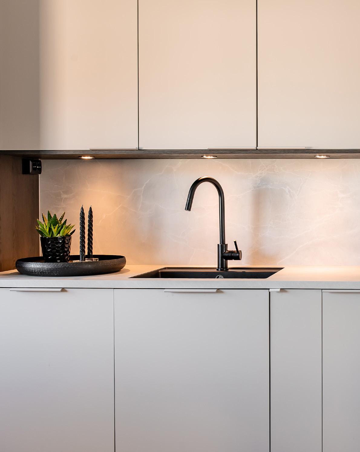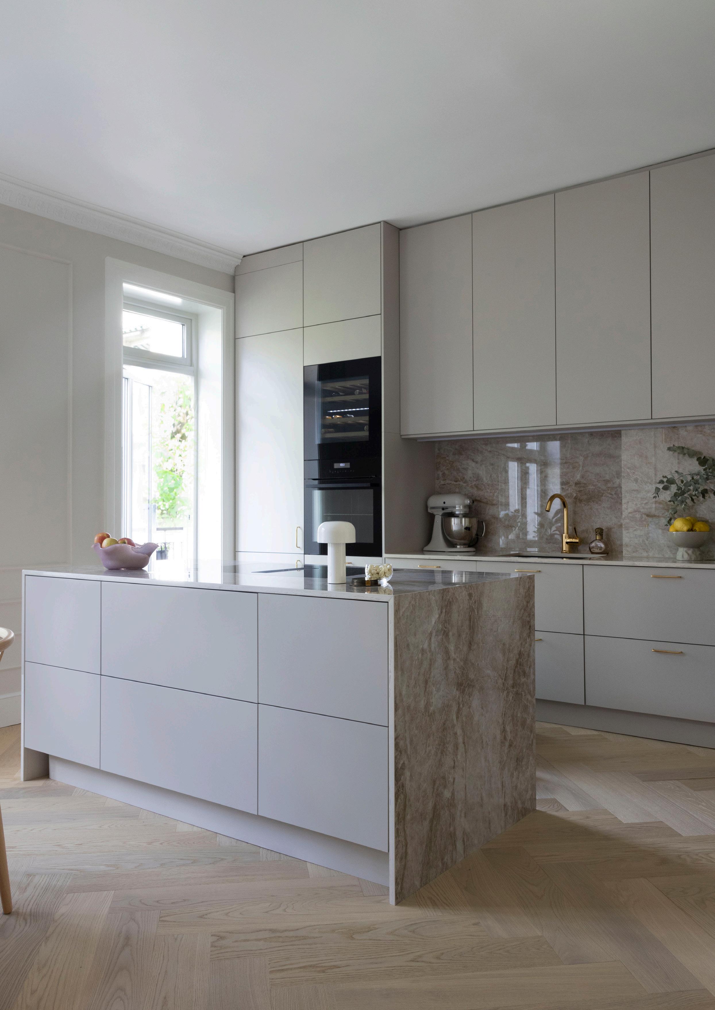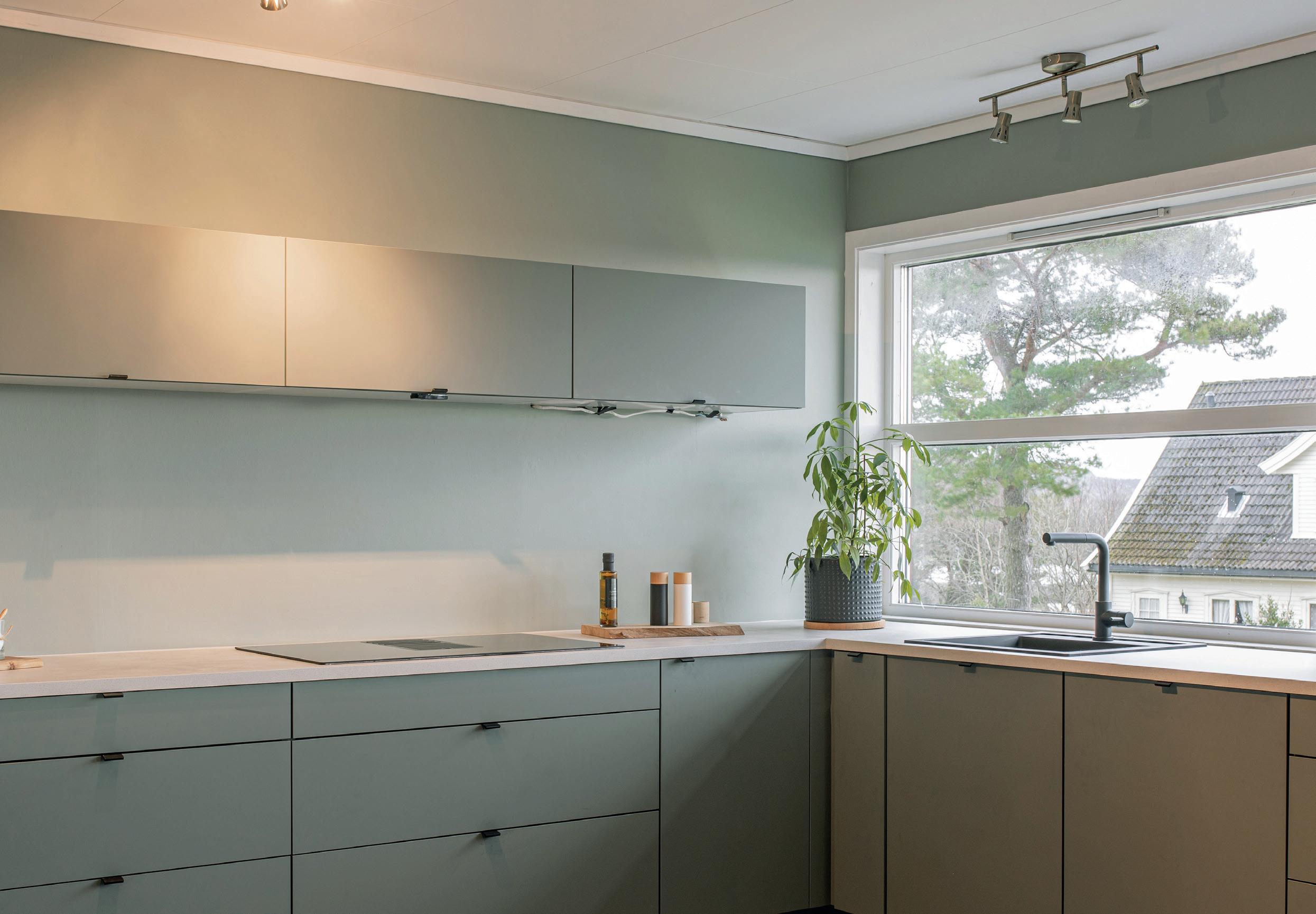 For å skape enda mer harmoni, har de dekortert med spiler i samme farge på veggen og over øya – et grep som gir rommet et helhetlig og moderne uttrykk.