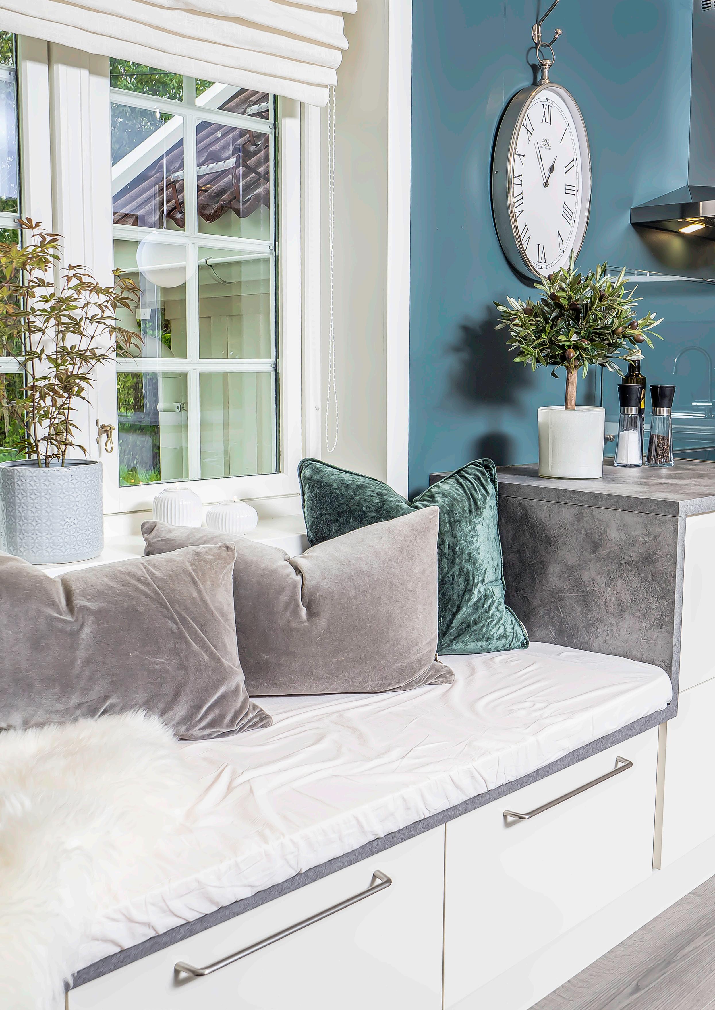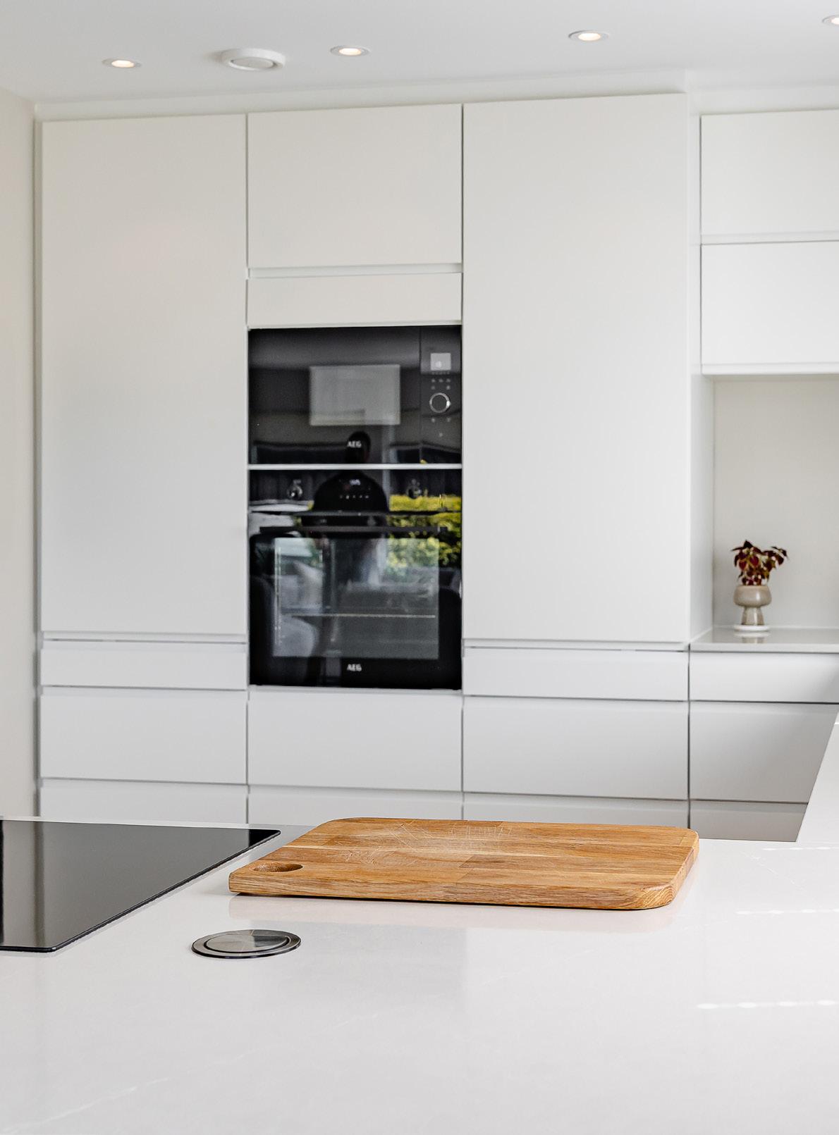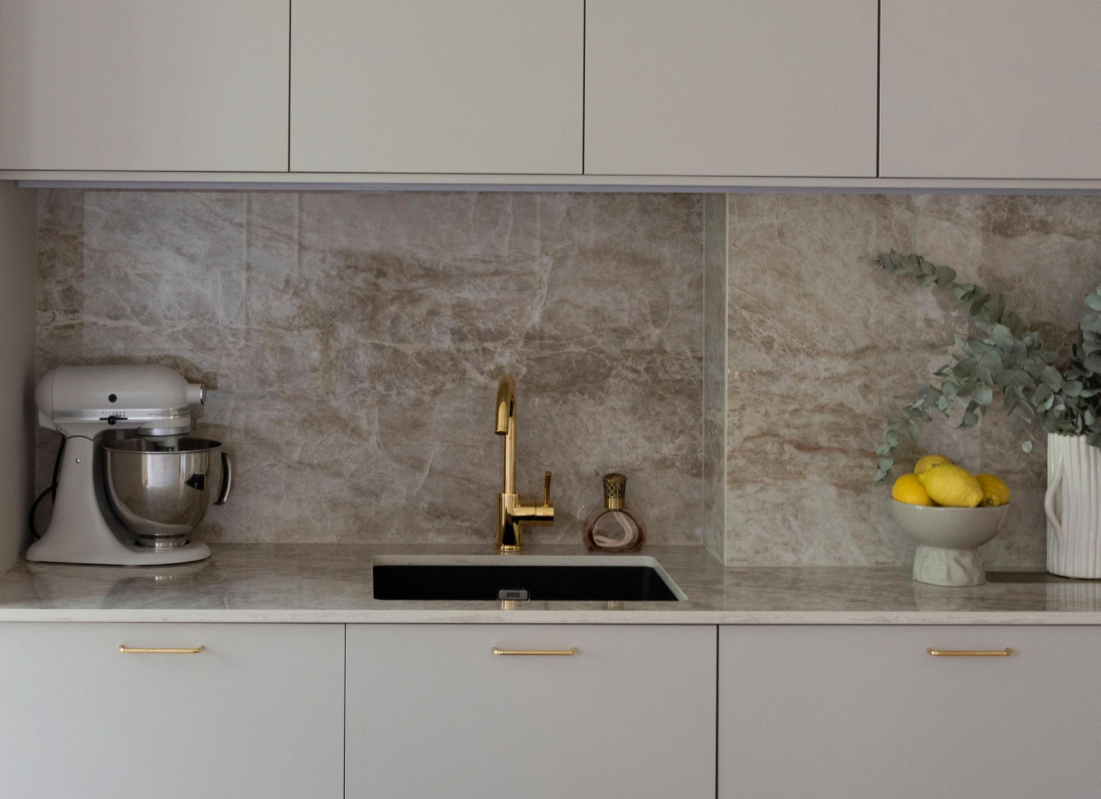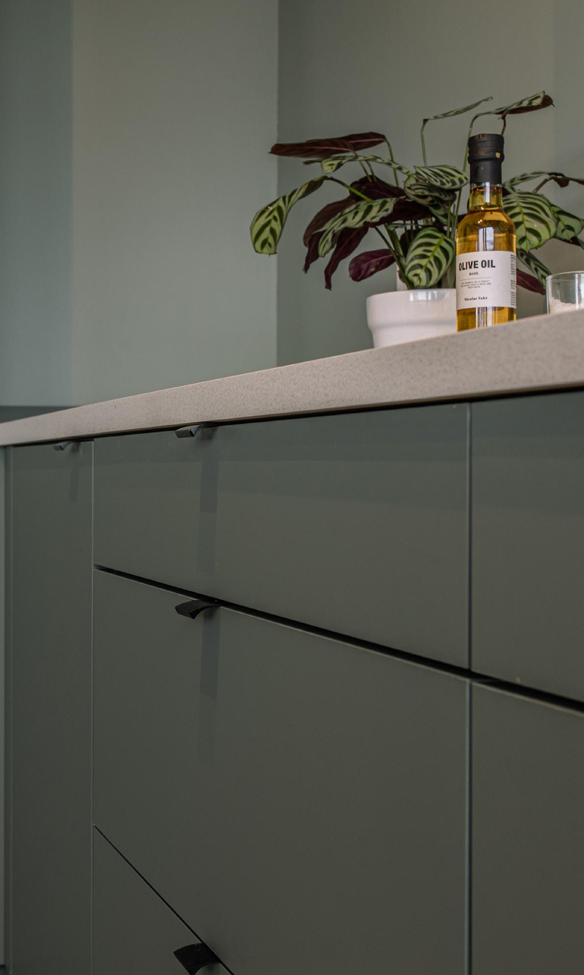 For å skape enda mer harmoni, har de dekortert med spiler i samme farge på veggen og over øya – et grep som gir rommet et helhetlig og moderne uttrykk.