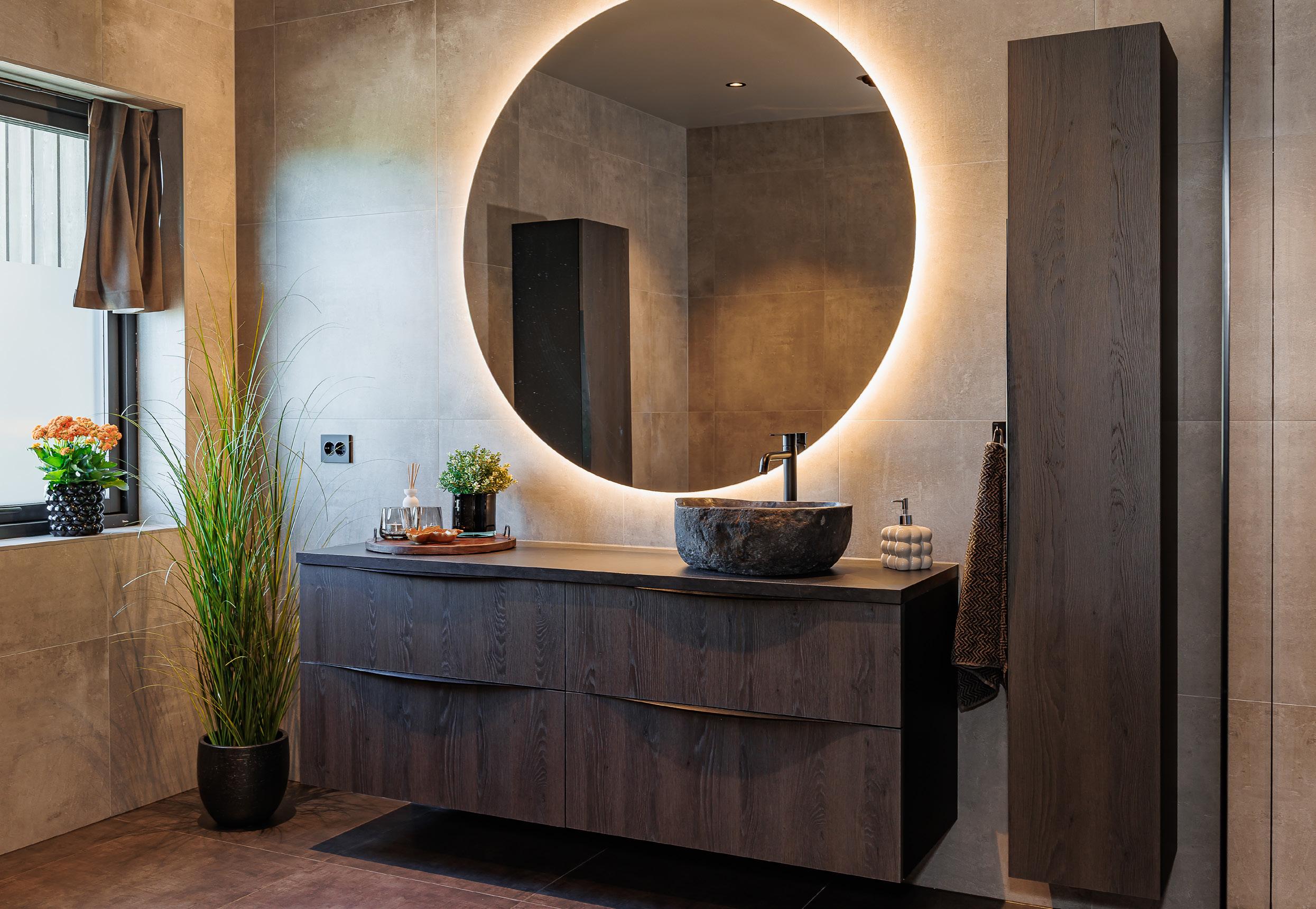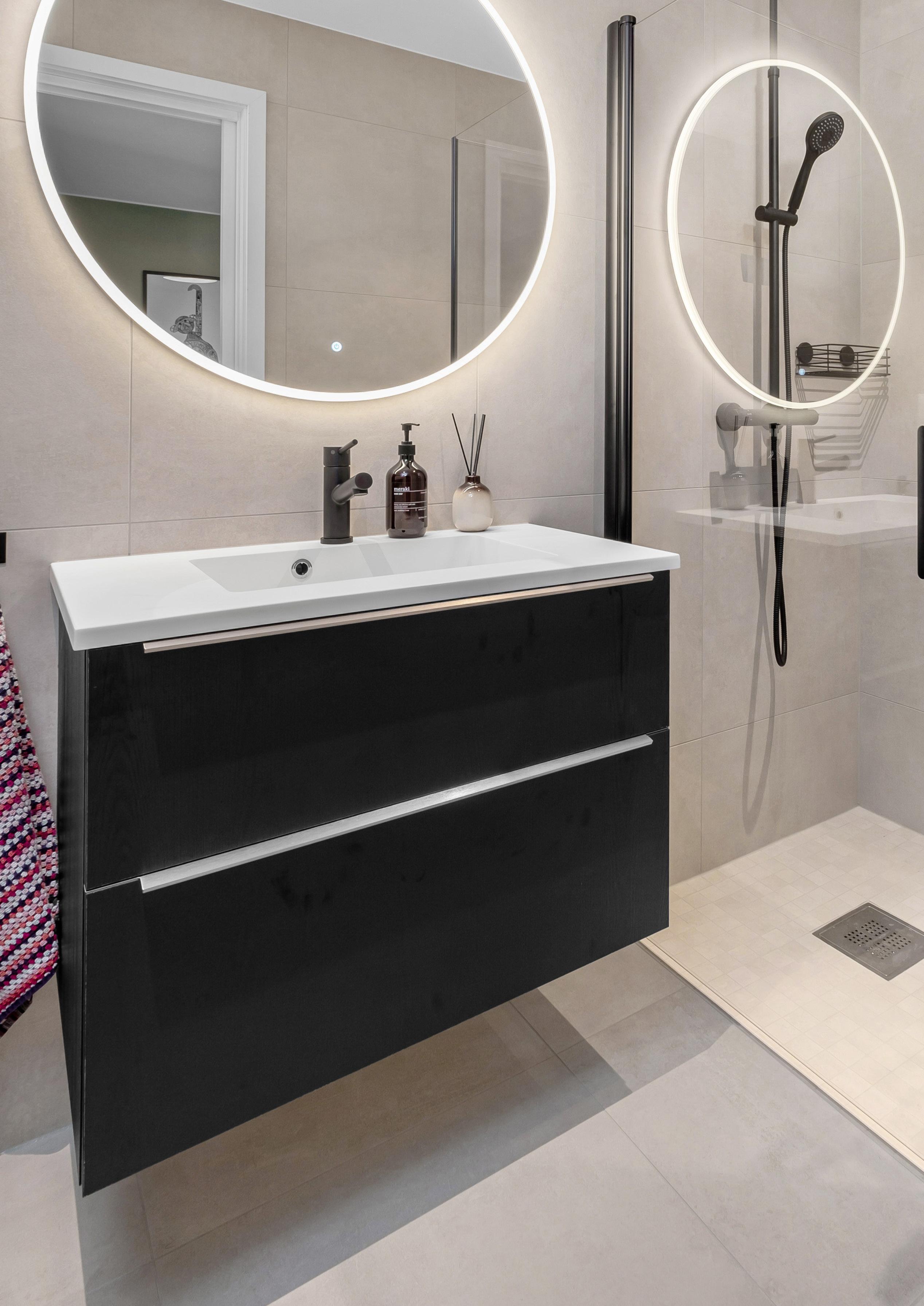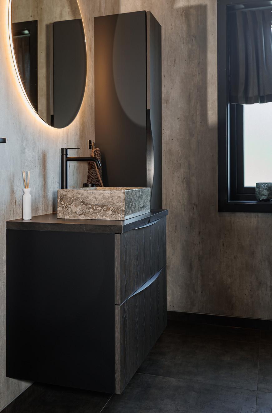Den mørke eiken går igjen på husets to bad, hvor paret har valgt store, romslige skuffer kombinert med et skap for ekstra oppbevaring. Resultatet er praktiske løsninger som samtidig gir et luksuriøst og varmt preg.
