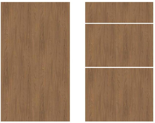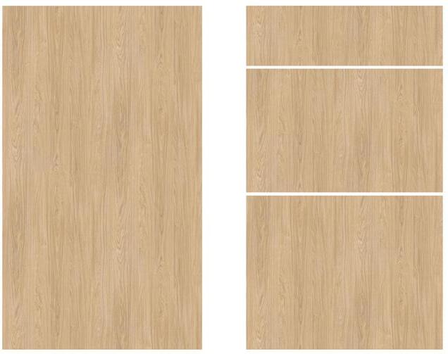 Riga-modellen er laget av 19 mm sponplater med et slitesterkt melaminbelegg som har en synkronisert struktur, noe som gjør at du kan kjenne treets åremønster. Kantene er forsterket med en solid, avrundet 0,8 mm ABS-kant for ekstra holdbarhet.
