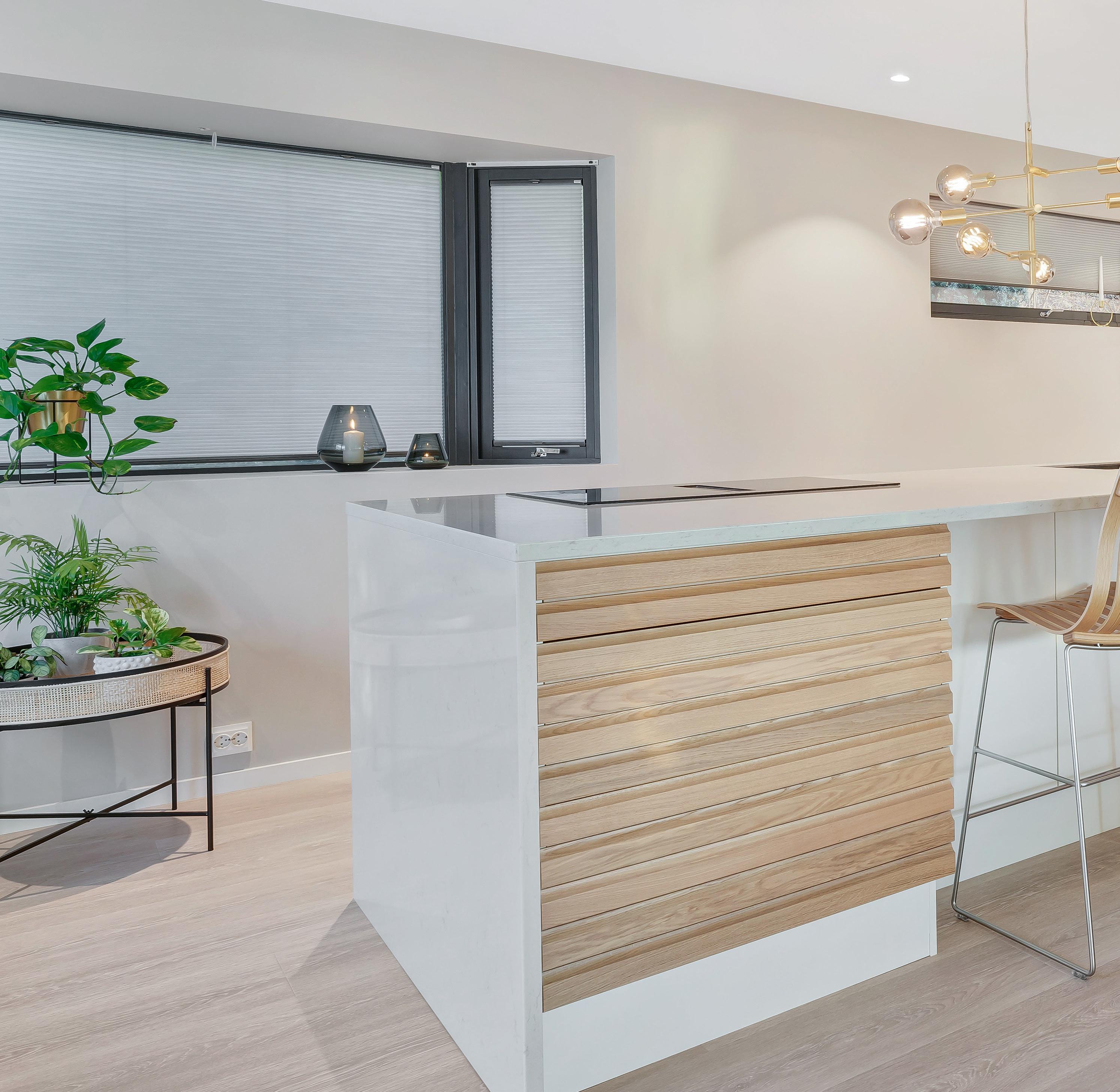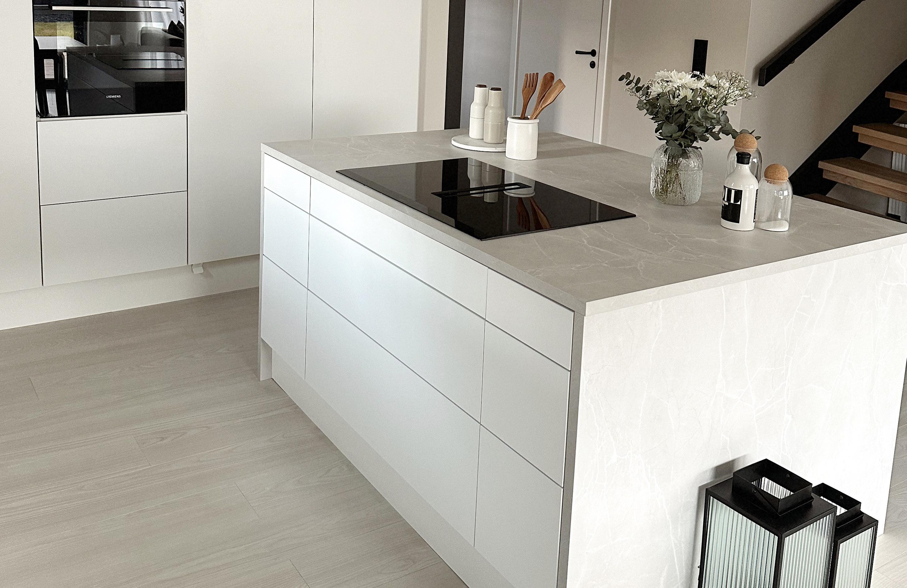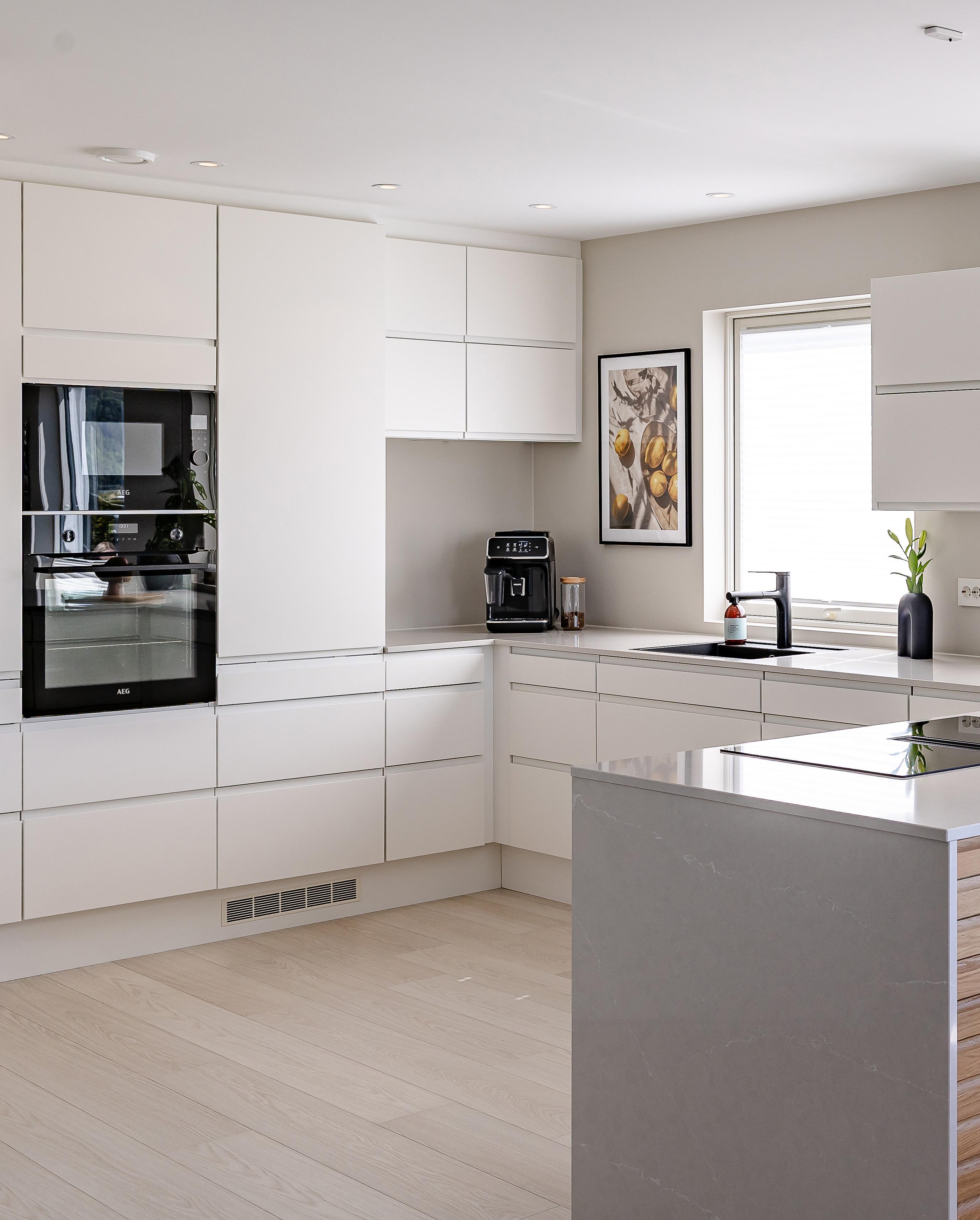 På dette bildet ser du Barcelona hvit kombinert med Bergen brun eik på kjøkkenøya.