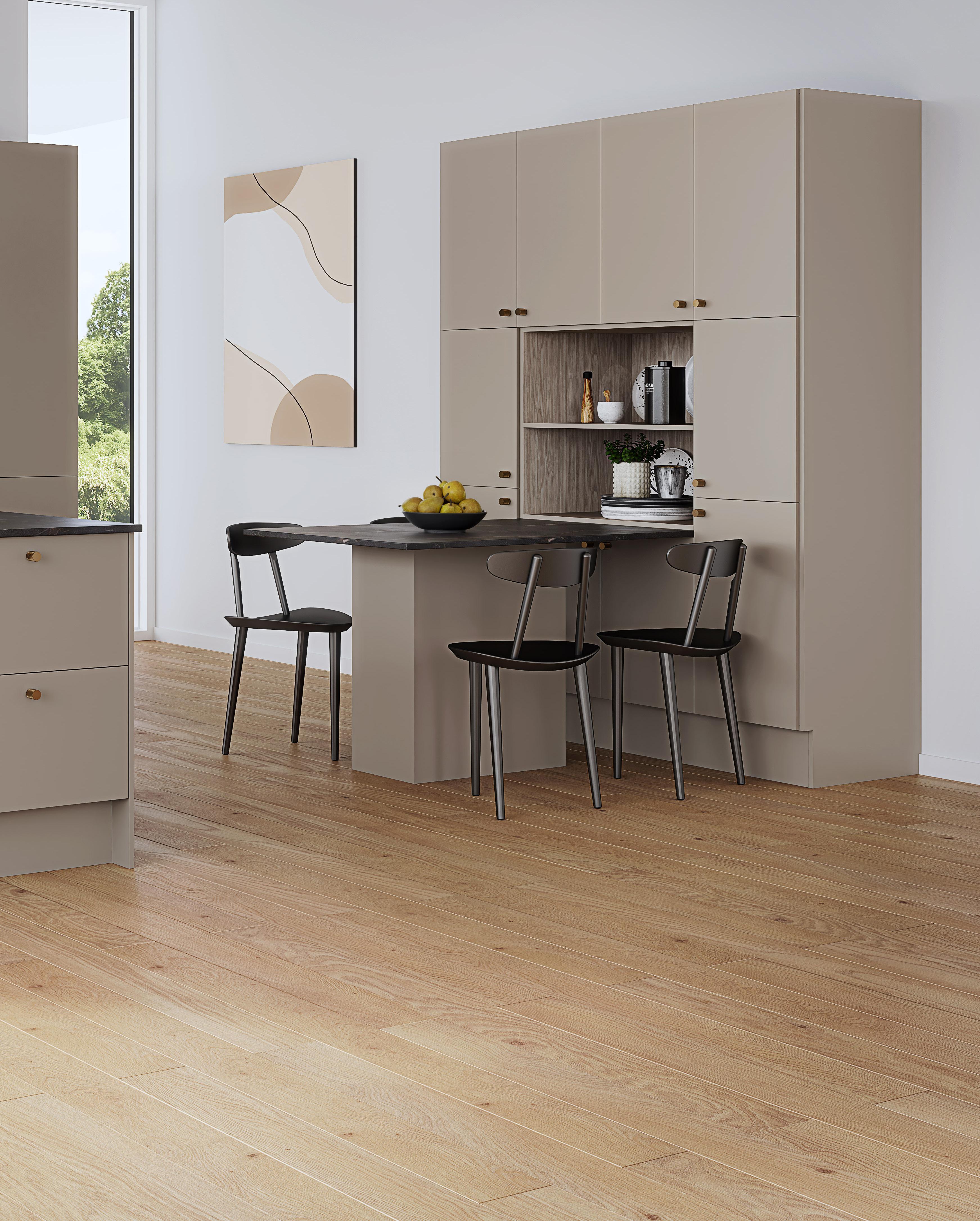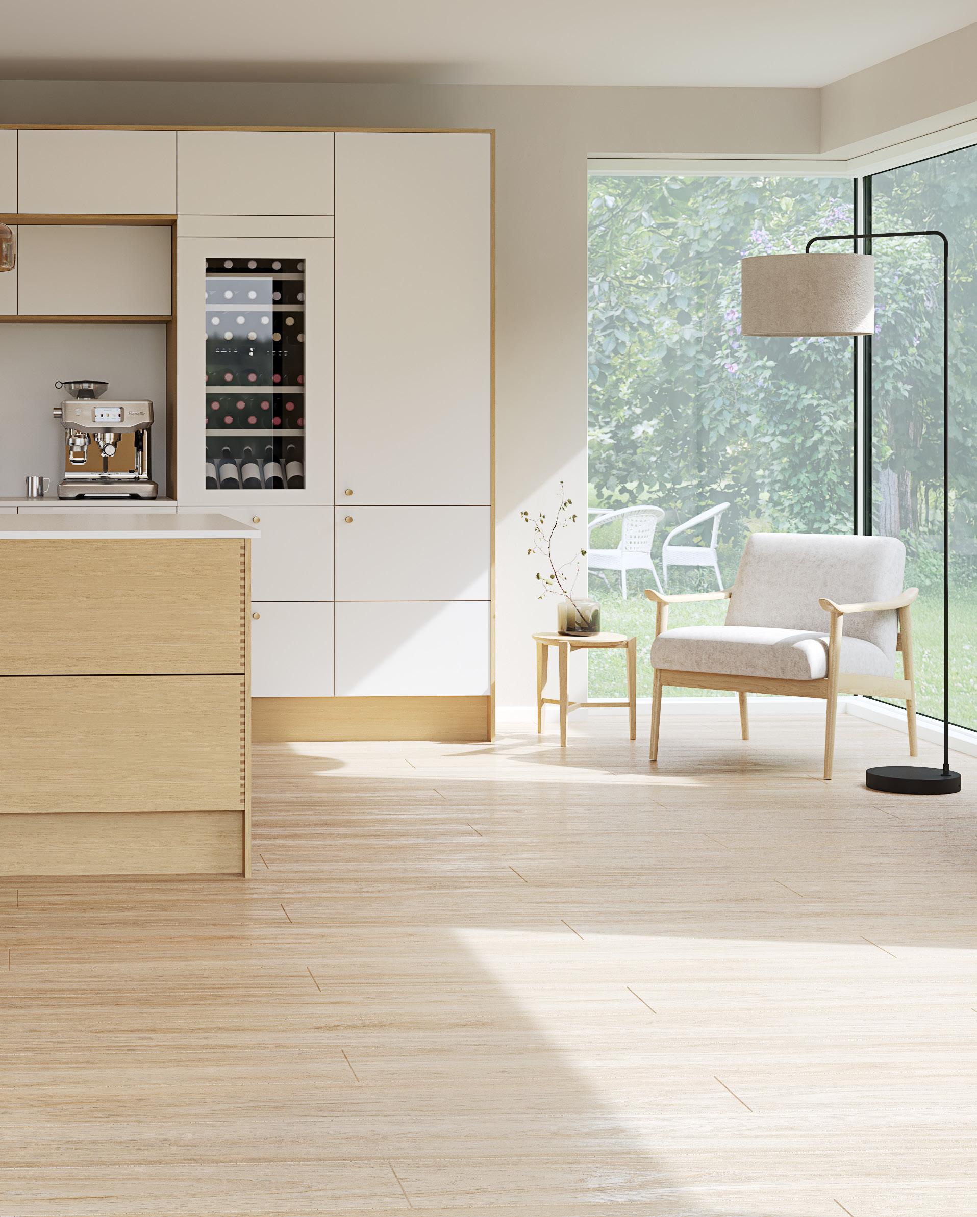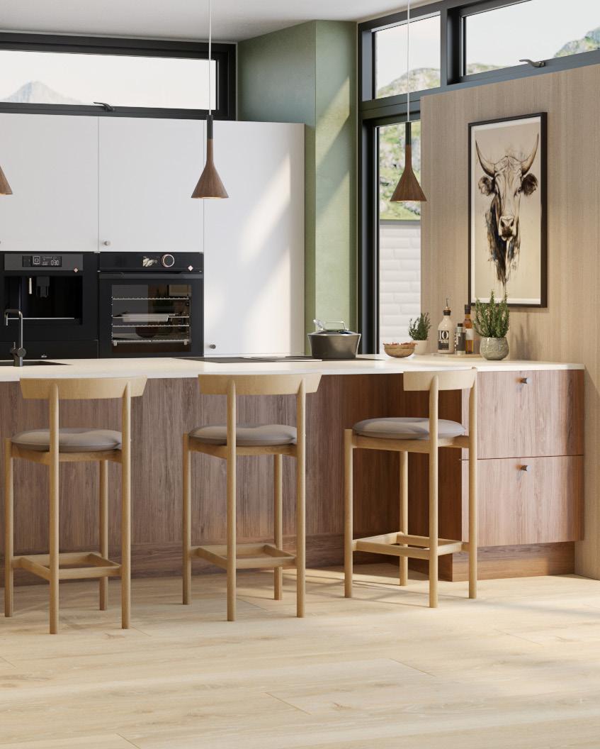 På dette bildet ser du Barcelona hvit kombinert med Bergen brun eik på kjøkkenøya.