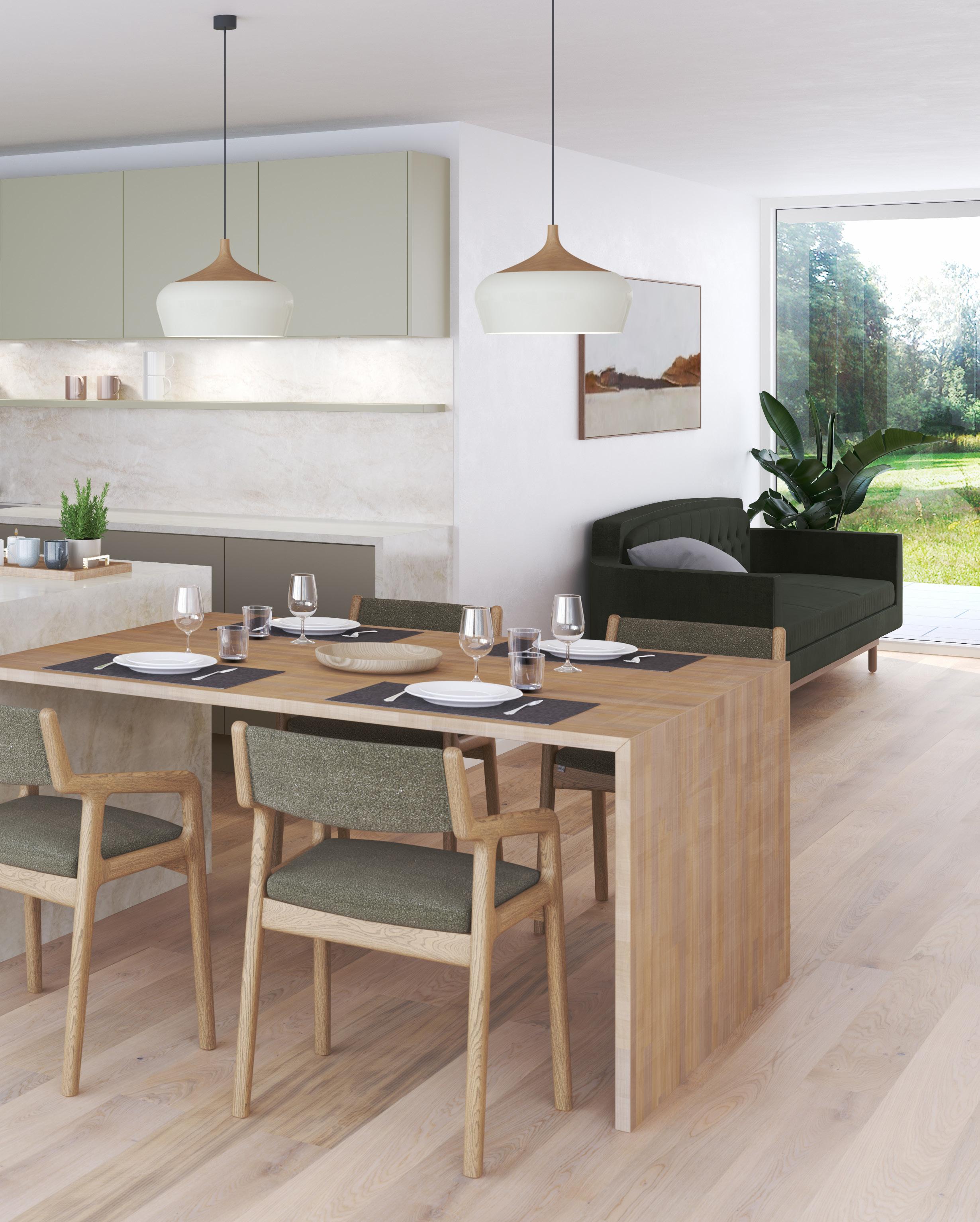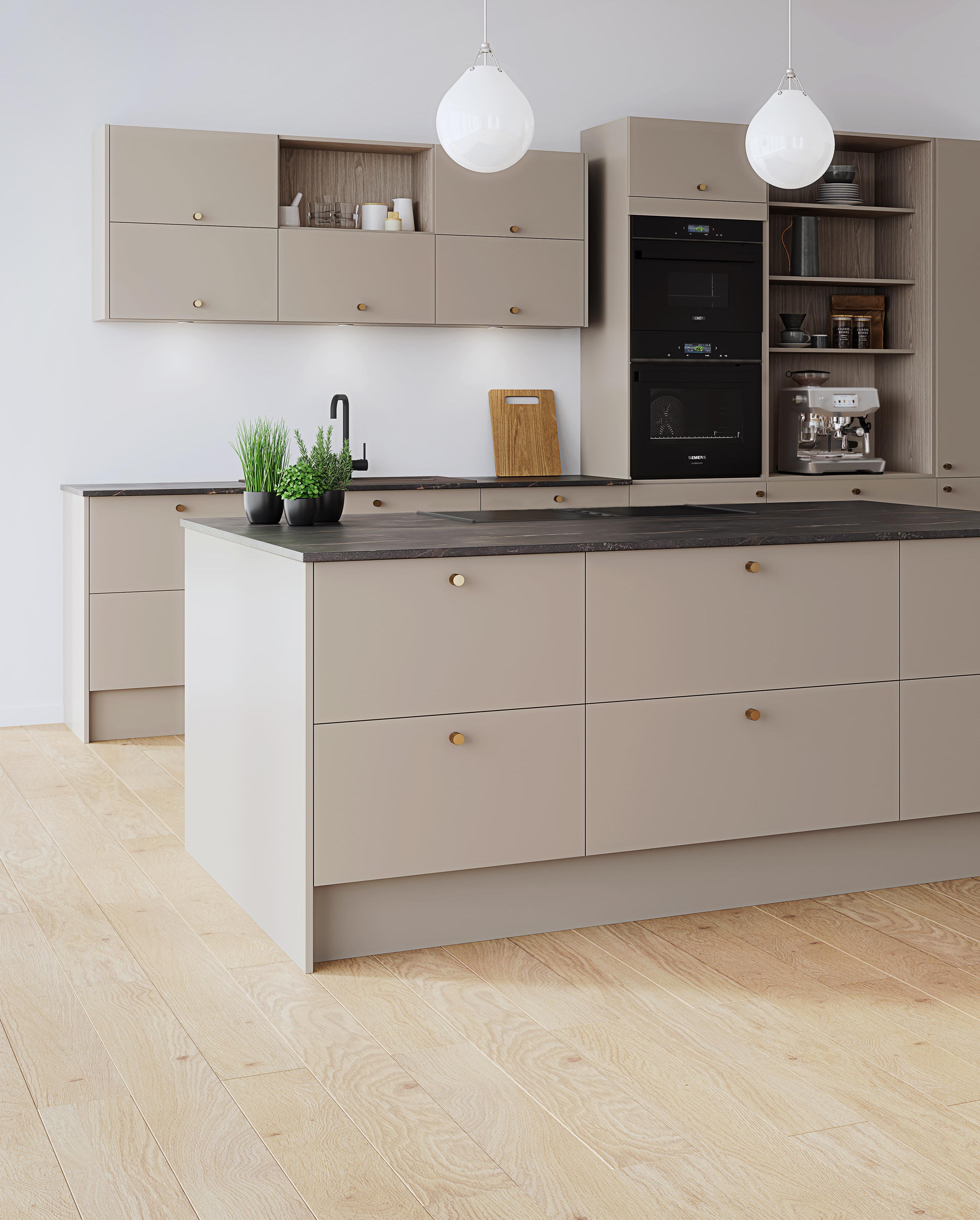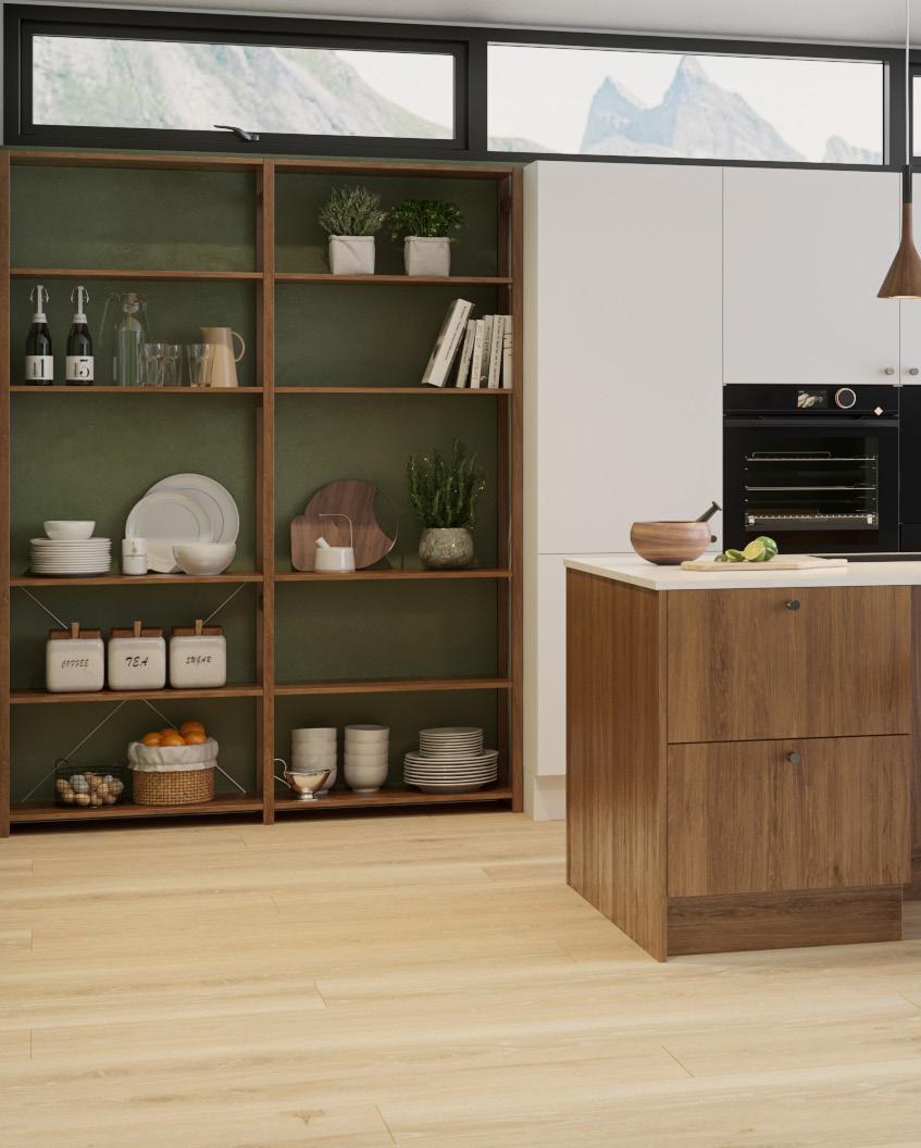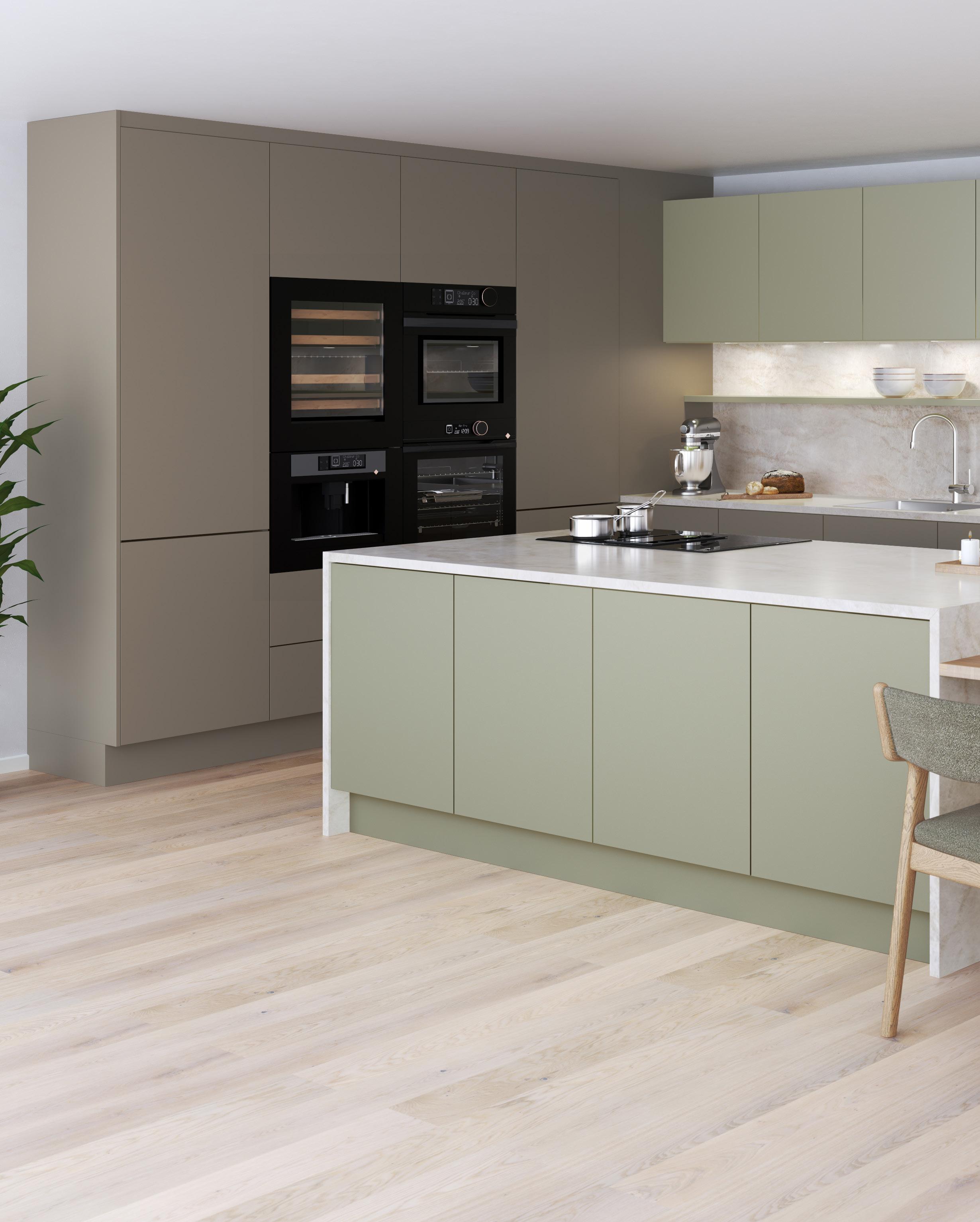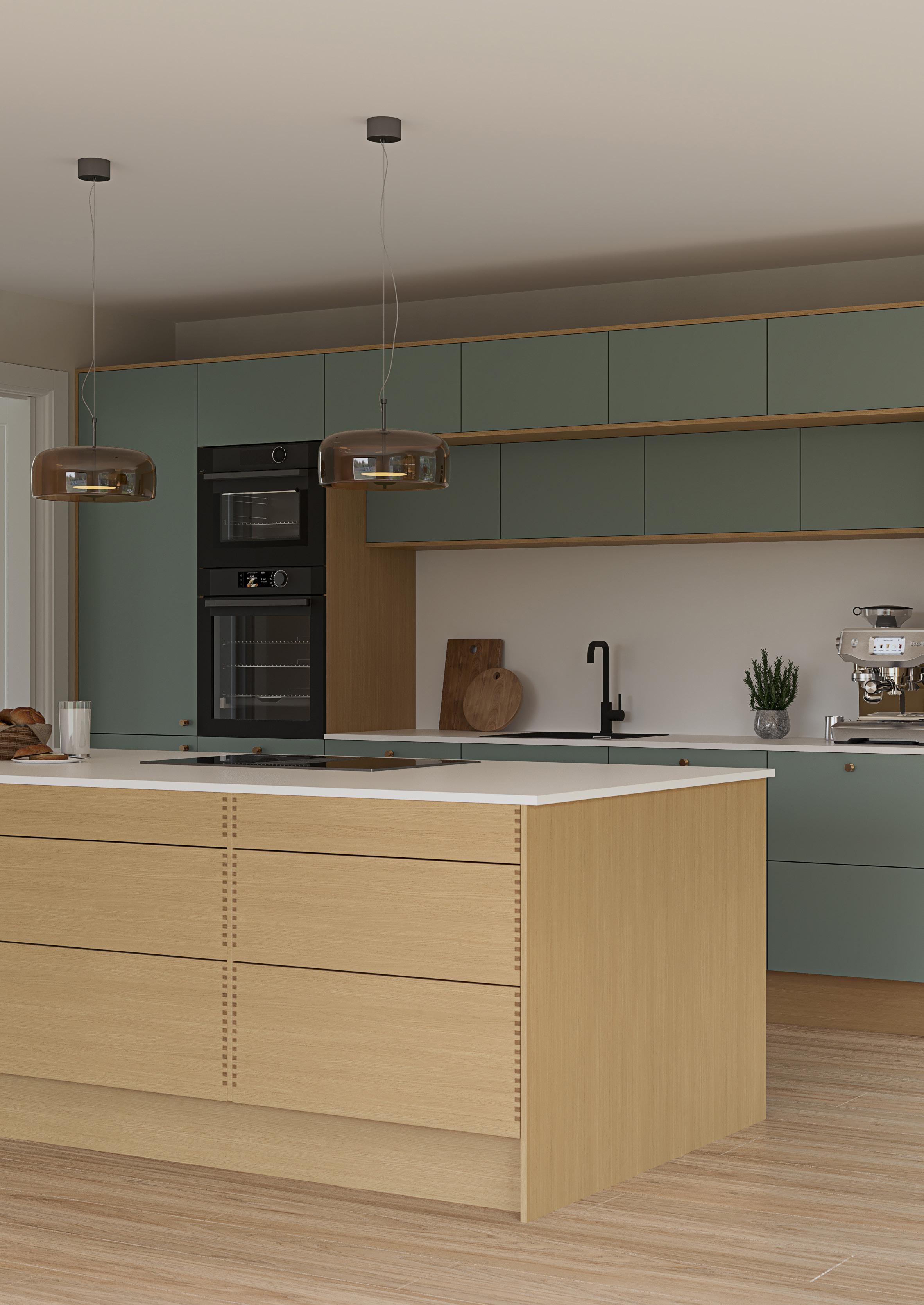 Design er en av våre mest slitesterke fronter i høytrykkslaminat. Inspirert av naturen har vi her kombinert fargen Terra på høyskap og underskap med den lysegrønne nyansen Mist på kjøkkenøy og overskap. Benkeplaten i PFP Dekton Arga Stonika er videreført opp på veggen under overskapene, noe som gir et helhetlig og eksklusivt uttrykk. Resultatet er et kjøkken i naturlige, harmoniske toner.