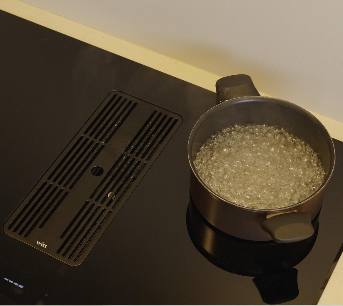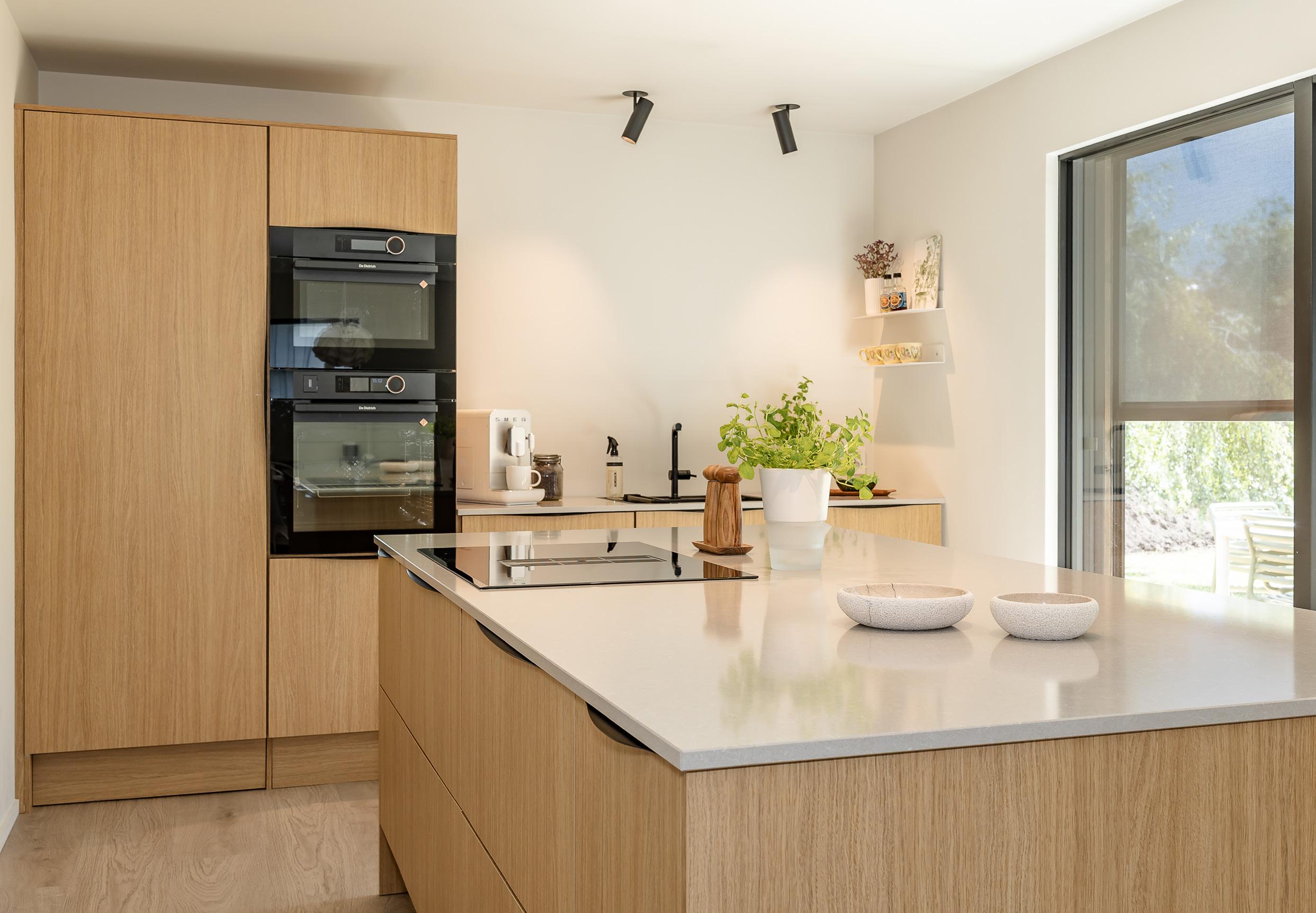 Kjøkkenet er levert i Riga nordisk eik, og på kjøkkenøya har kunden valgt koketopp med integrert ventilator. Det gir en stilren løsning som gjør rommet luftig og moderne.