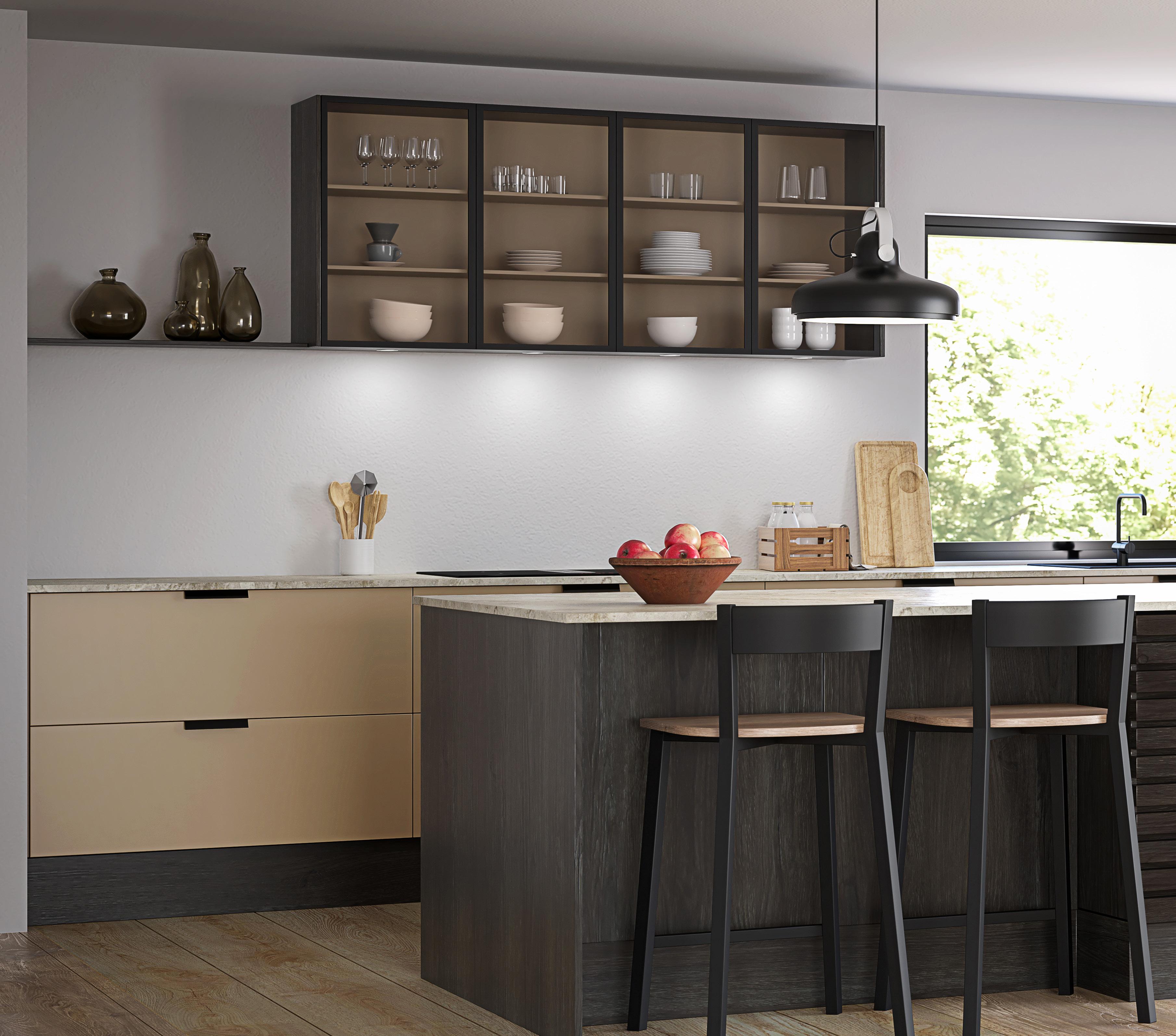 I dette kjøkkenet har vi valgt vår prisgunstige modell Barcelona sand kombinert med Riga mørk eik på sokler, gavler, vitrineskap og kjøkkenøy.