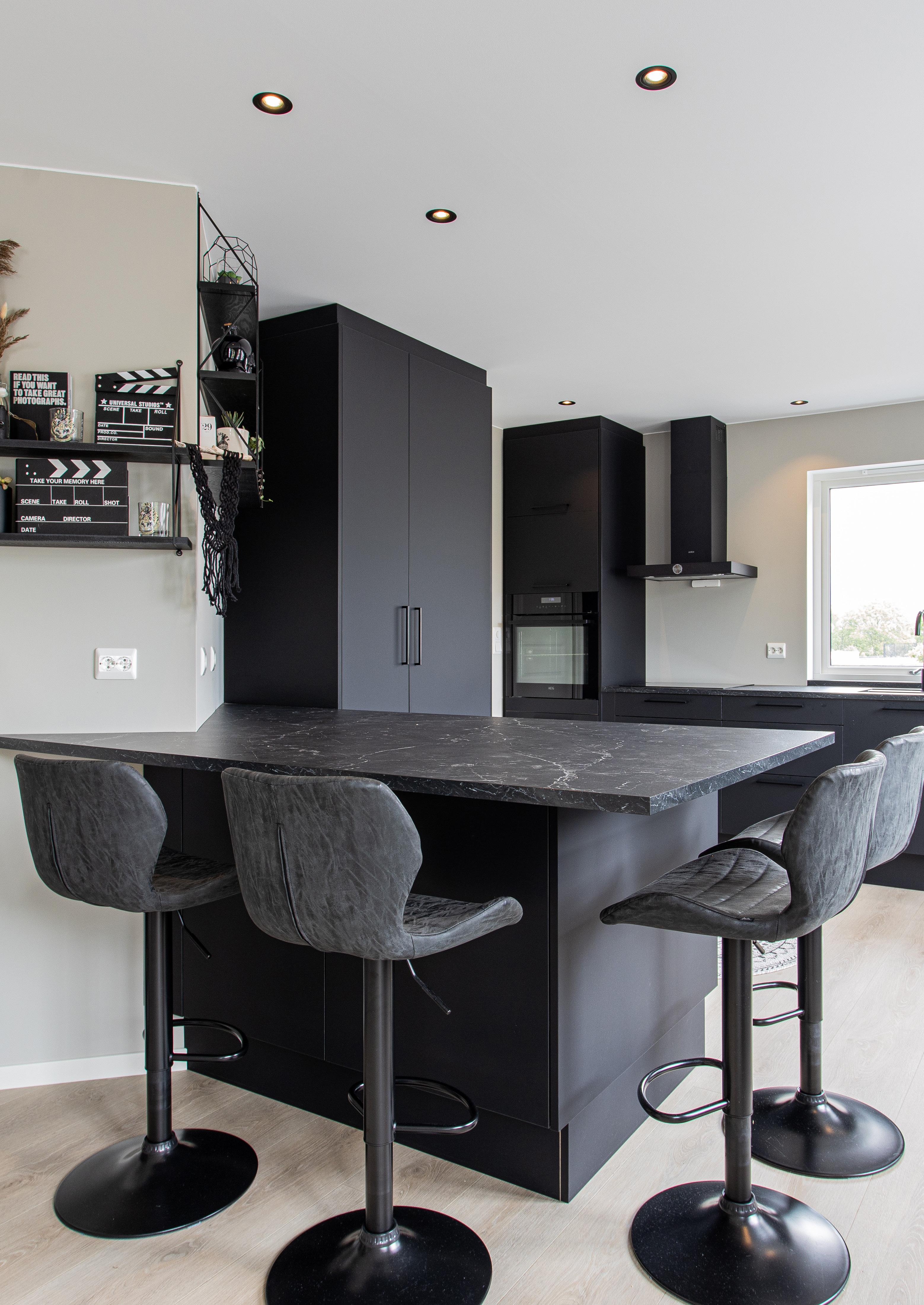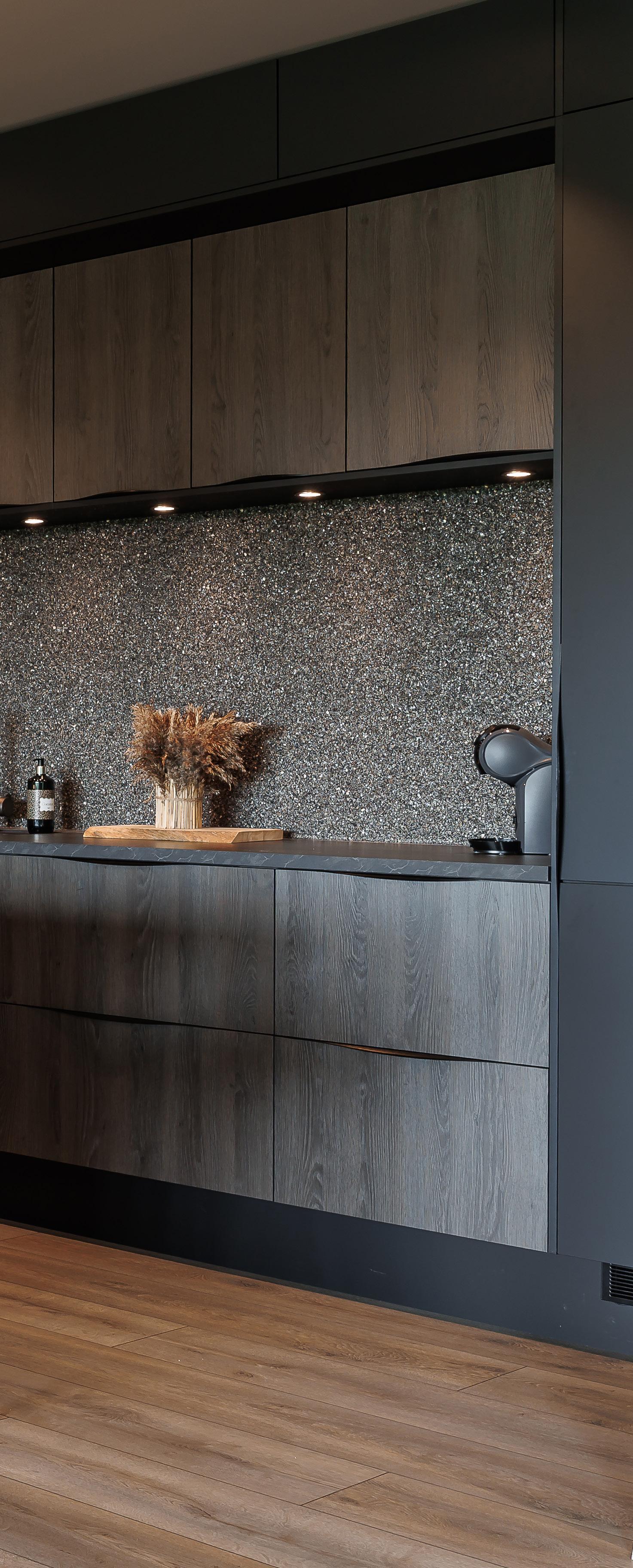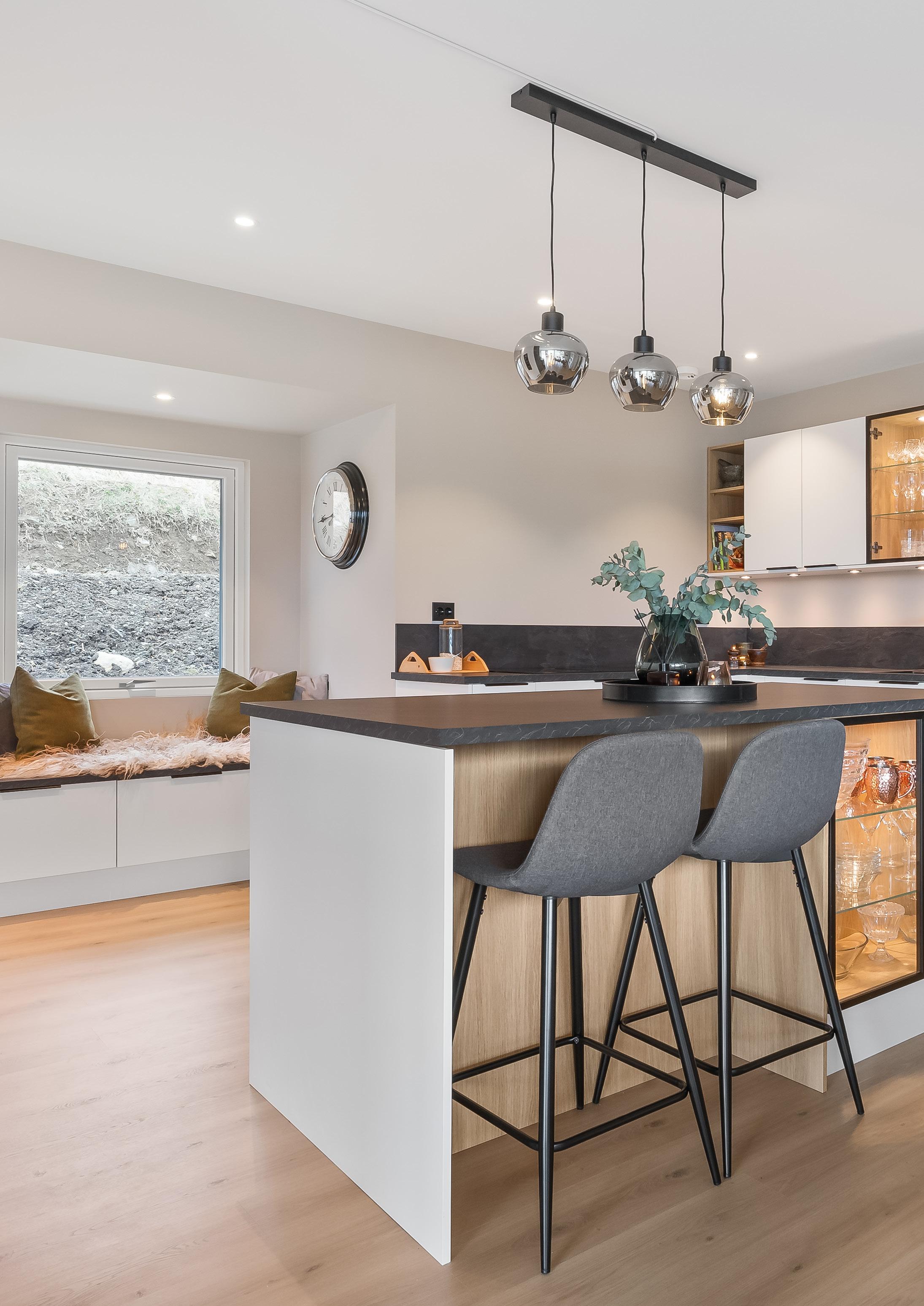 Hjertet i hjemmet er kjøkkenet, hvor paret har valgt en stilig kombinasjon av Milano matt sort og Riga mørk eik. De mørke frontene rammer inn kjøkkenskapene, mens kjøkkenøya får et eksklusivt uttrykk med lameller i mørk eik og en vitrineløsning.