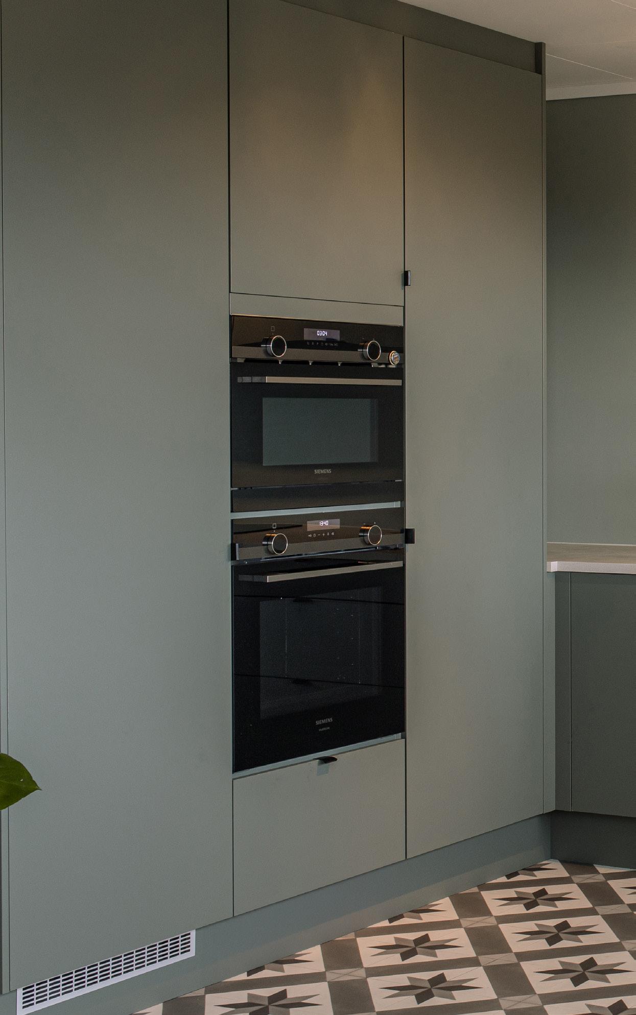 I Farsund finner vi dette stilfulle kjøkkenet i modellen Pisa grønn,som går ton-i-ton med veggene, noe som skaper et harmonisk og elegant uttrykk i rommet. Denne monokrome fargepaletten gir en beroligende følelse og fremhever kjøkkenets helhetlige design.