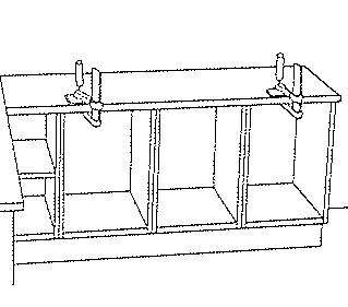 Bordplader fastgøres til skabene med skruer gennem de forborede huller. Bordpladerne fastholdes eventuelt med skruetvinger – husk beskyttelsesklodser. Bemærk! Anvendes der ikke bagkantlister skal der forsegles med silicone mellem væg og bordplade.