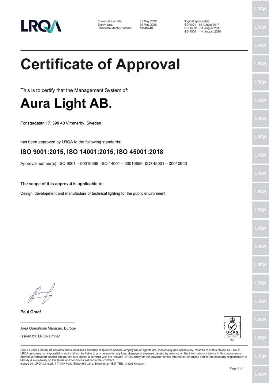 Aura Light-konsernet er sertifisert i henhold til ISO 9001 og 14001 . De fokuserer kontinuerlig på optimalisering av deres kvalitets- og miljømål
