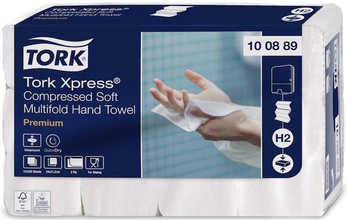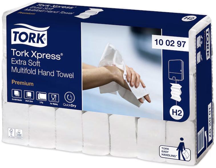 Ekstra myk Multifold håndtørk H2 Tork Express papirhåndkle. Sekk á 21 pakker á 100 ark. Vnr. 262340