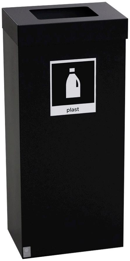 Komplett sett med avfallbeholdere for mat, papp og papir, plast og restavfall. Ferdig merket med etiketter i svart/hvit. Topp med brevsprekk for papir, resten har redusert innkast. Utførelse i gråsvart RAL7021 slitesterk Sahara lakk. Sammenkoblingsbraketter må kjøpes i tillegg, og brukes for at beholderne blir stående i riktig posisjon. Du behøver 1 stk brakett per 2 beholdere.