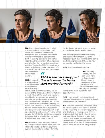 banks should exploit the opportunities and embrace these developments. The entire payments area is changing drastically. I think that PSD2 is the necessary push that will make the banks start moving forward. Otherwise, new competitors will enter the scene. MJR: And they already do that... MV: Yes, they already do. We can see it here in Copenhagen. Copenhagen is developing a hub for this type of technology because the city has decided to make the most out of the new opportunities.