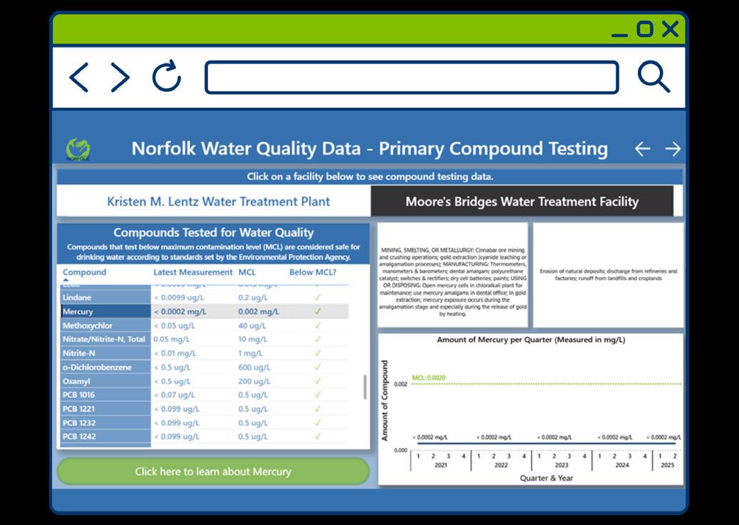 The interactive dashboard presents EPA-required testing data alongside quarterly reports, allowing residents to explore results in a clear and visually engaging format. By providing detailed information about tested compounds, including their sources, uses and EPA health guidance, the tool helps residents understand what is in their water and how water quality is monitored.