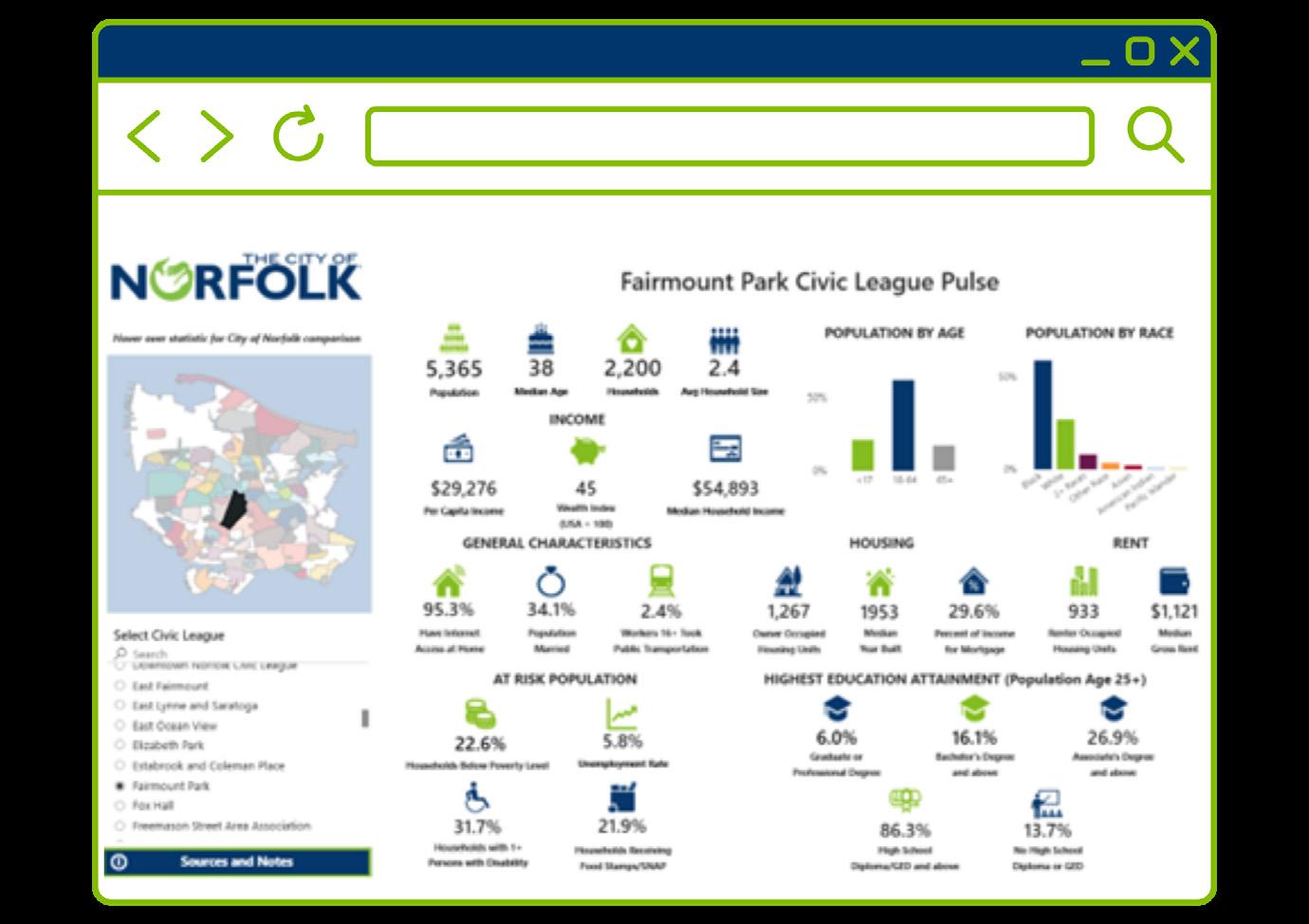 CivicLab launched the Civic League Demographics Dashboard in October 2025, available through the Open Data Portal. The dashboard provides demographic information for each civic league in Norfolk, including population, household characteristics, income, race, age, housing and educational attainment. Designed in response to growing requests from City departments and community organizations, the tool consolidates data in one accessible location to support analysis, grant applications and neighborhood-focused outreach.