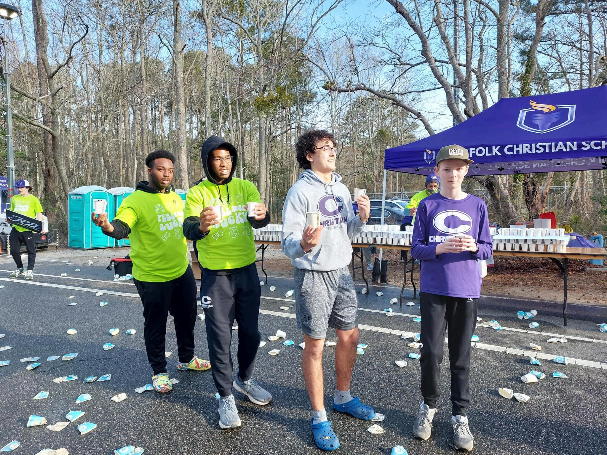 A group of our FCA student-athletes showed up at the Shamrock Marathon while it was still dark to set up a water station for runners