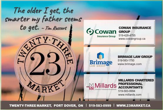 THOMPSON WATERSFUNERALHOME Cremation&Burial102FirstAvenue,PortDover 519-583-1530 BobbiAnnBrady.com 50BGilbertsonDrive,Simcoe,ONN3Y4L8 Tel:519-428-0446|Fax:519-428-0835 Mailing:P.O.Box91,Simcoe,ONN3Y4K8 BABrady-CO@ola.org ConstituencyOffice Bornandraisedin Haldimand-Norfolk, BobbiAnnhasa deep-rootedpride forourarea anditspeople. FROMTHE CHAIR. 355 MainSt,PortDover, ONN0A 1N0 www.bladesalon.ca|519-583-2021