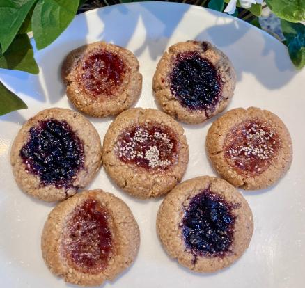 Preheatovento350degrees.Lineabakingsheetwithparchmentpaper.Mixallingredients togetherinamediumbowlexceptjam.Onceastickyballisformed,rollinto1"ballsand placeonbakingsheet.Pressthumbintocentreofeachball,makingacrater.Fillcraterwith yourfavouritejam.Bake15-20minutesuntiljamisbubbly.Allowtocoolandfirmupon wirerack.