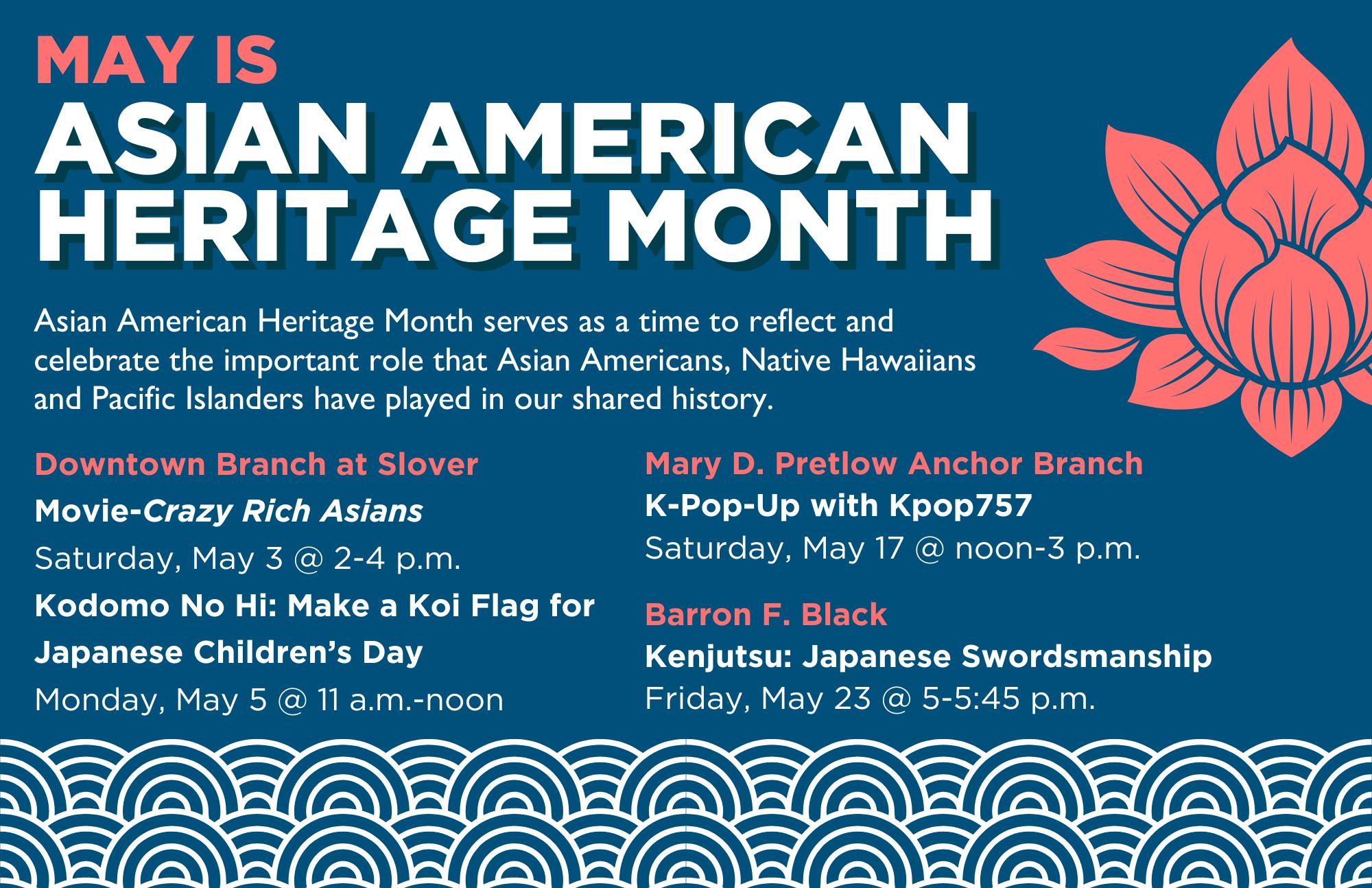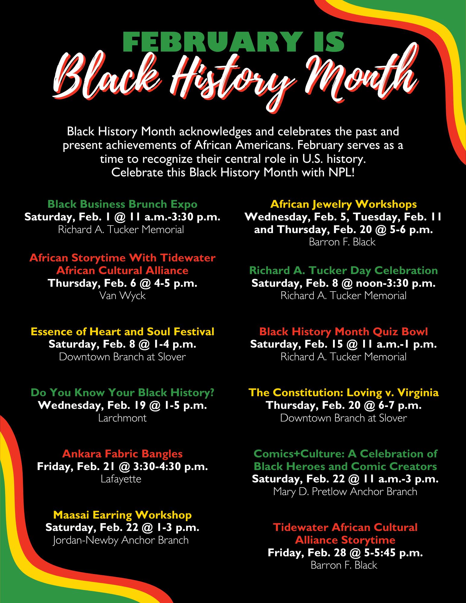 We also have some special events scheduled during the upcoming months: Richard A. Tucker Day at his namesake Memorial Library and the Essence of Heart and Soul Festival at the Downtown Branch at Slover to commemorate Black History Month, a portrayal of Norfolk civil right hero Evelyn T. Butts by the Arts for Learning’s Valerie Davis in honor of Women’s History Month and the Kenjutsu: Japanese Swordsmanship event at Barron F. Black to celebrate Asian American and Pacific Islander Heritage Month, just to name a few.