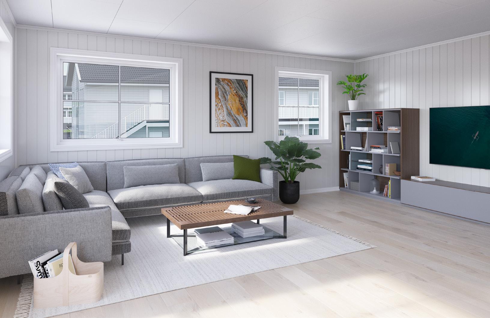 Når du kommer inn i leiligheten, har du fri sikt mot de store vindusflatene i den åpne stueog kjøkkenløsninga midt imot, noe som gir et lyst og trivelig førsteinntrykk. Fra stua er det utgang til balkong.