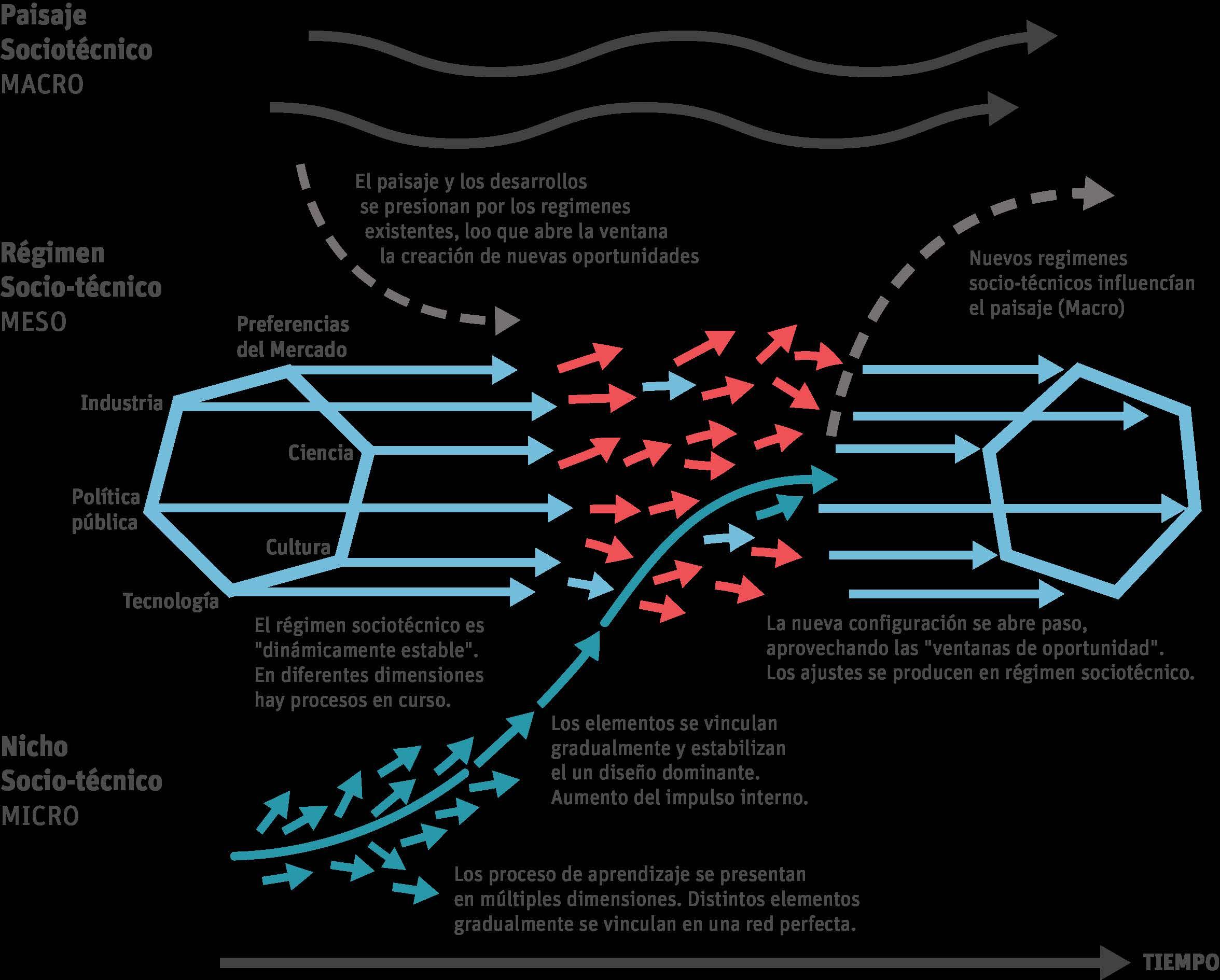 Un proceso de cambio estructural, sistémico y no lineal en las culturas, estructuras y prácticas dominantes de los sub-sistemas sociales que tiene lugar durante un período de décadas.