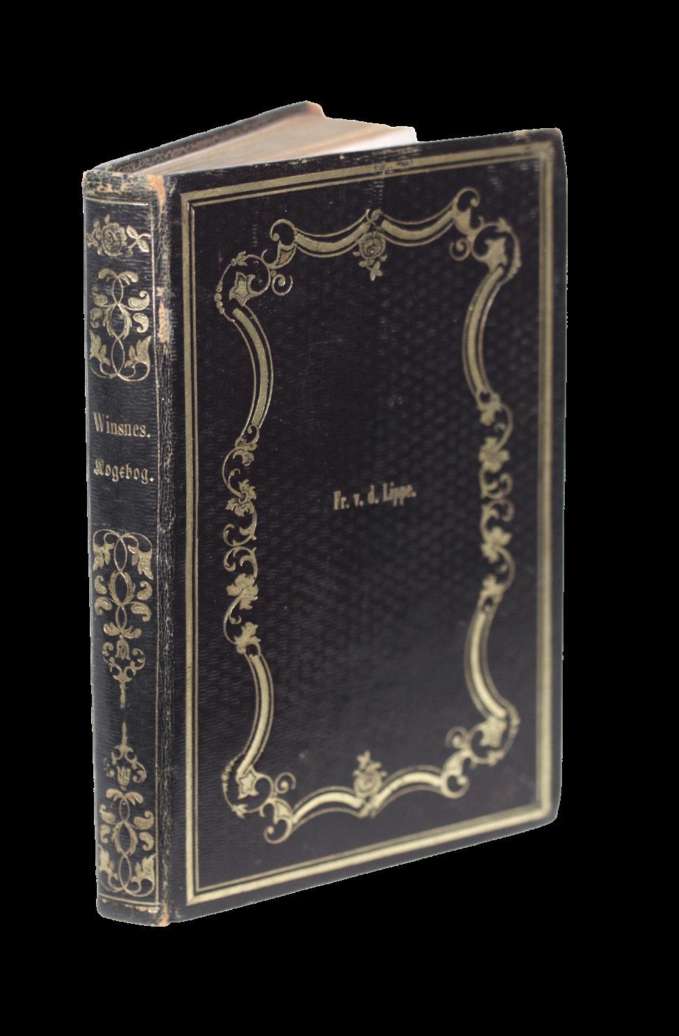 146 WINSNES, Hanna: Lærebog i de forskjellige Grene af Huusholdningen. Sjette Oplag. Christiania. 1856. 8vo. VIII, 368 s. Samtidig sort helmaroquinbind med rik og tidstypisk gulldekor på hele bindet. Helt gullsnitt. Litt slitasjemerker på bindet og litt brunpletter i materien.(134146) 3.500,Notaker 515.6 Hvorledes Østers spises raa, er Enhver bekjendt; ... Å finne Hanna Winsnes i en slik drakt er ikke hverdagskost. Et usedvanlig eksemplar!