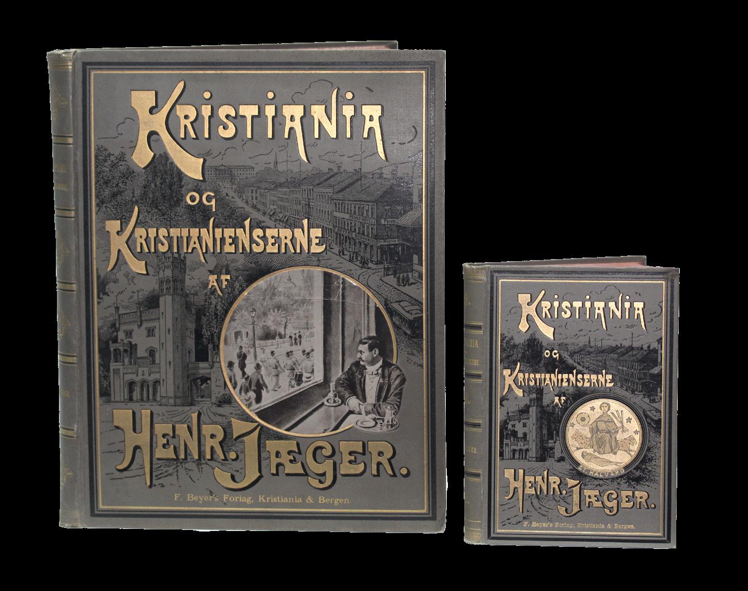 Henrik Jæger hadde et friskt syn på hovedstaden, og derfor er hans tekst ofte sitert i ettertiden. Dette er den såkalte praktutgaven med de 12 fotografiene, fra Peisestuen på Holmenkollen, Trefoldighetskirken, Akershus, Carl Johans gate, Victoria terrasse etc. En av de virkelig påkostede utgivelsene om Christiania!