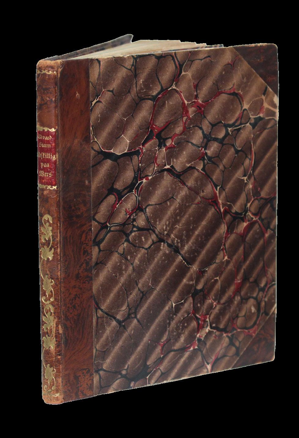 140 (STORM, Edvard): Adskilligt paa Vers ved Erland Siverssen. København. 1775. 4to. 79, (1) s. Bundet i et 1800-talls skinnbind med rik gulldekor på ryggen, rød titteletikett og marmorert overtrekksppair på permene. Merke etter bortatt ex-libris. Rent eksemplar.(135510) 4.500,Edvard Storms uvanlige debut.