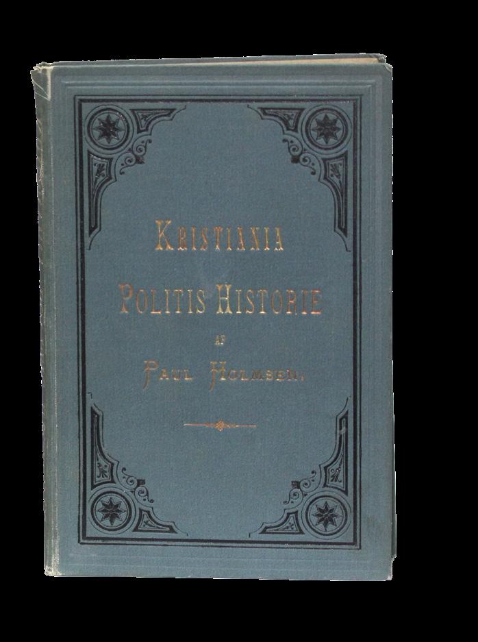 26 HOLMSEN, Paul: Kristiania politis historie 1624-1884. Kristiania. 1884. 8vo. (2), VI, (1), 264 s. Orig. helsjirtingbind. Ryggen noe ufrisk, slitt øverst og nederst. Rester av lim i indre falser. Navn.(123576) 500,-