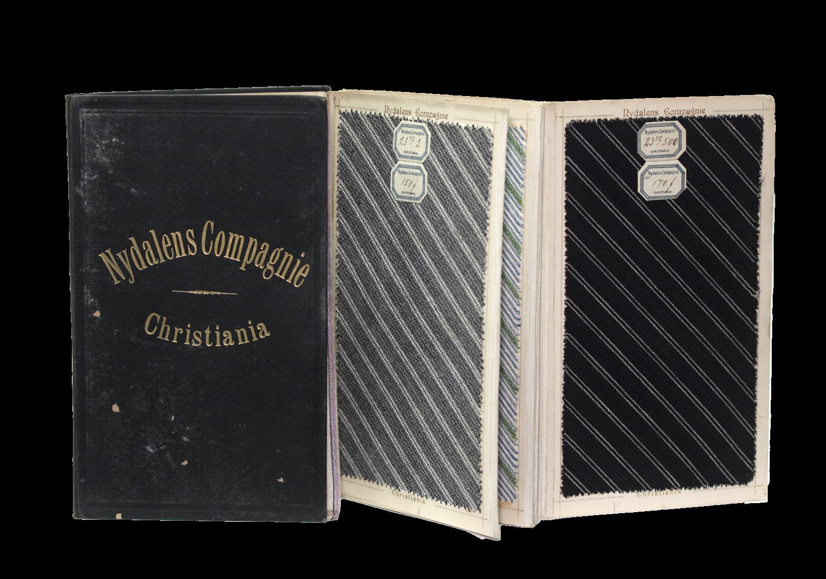 46 (NYDALENS COMPAGNIE) 11 originale mønstrede stoffprøver innsatt i et “salgsalbum” i sjirting med “Nydalens Compagnie Christiania” i gull på forpermen. Albumet er et leporelloalbum. Stoffene er 22 x 12 cm, limt på kartong. Ca. 1890-1900. (135814) 2.500,-