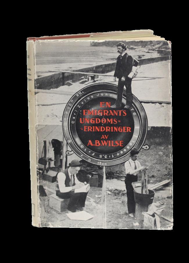 144 WILSE, A. B.: En emigrants ungdomserindringer. Oslo. 1936. 8vo. 122, (1) s. Illustrert i svart/hvitt. Originalt helsjirtingbind med vareomslag. Rifter i omslaget.(135820) 800,Flere fotografier fra hans barndoms Kragerø og fra USA. Med dedikasjon: “Til min ven og jagtkamerat Børre R. Gjertsen fra A. B. Wilse”. Hilsener fra Wilse er uvanlige.