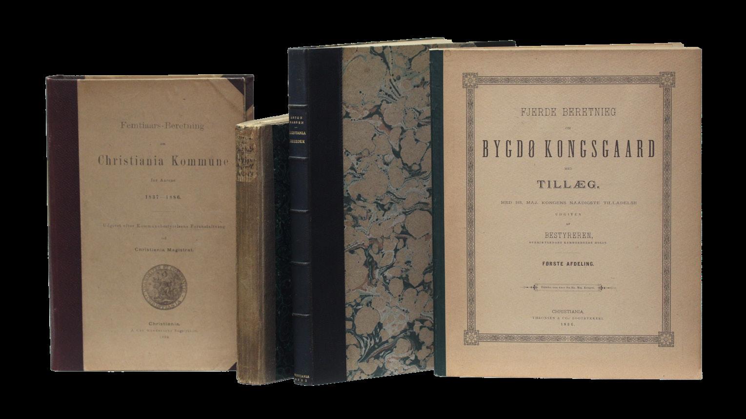 27 HOLST, Chr.: Fjerde Beretning om Bygdø Kongsgaard med Tillæg. Første afdeling. Christiania 1886. 4to. (2), 44 s. Med 1 foldet kart i farver over Bygdø + Gols gamle Stavkirke og Hovestuen paa Bygdø Kongsgaard. Christiania 1885. 4to. (2), 24 s. + Illustrationer til Hovestuen og Berdal- Stabburet paa Bygdø Kongsgaard. 20 sider. Innbundet i ett orig. kartonert innbd. med sjirtingrygg. (135489) 3.500,-