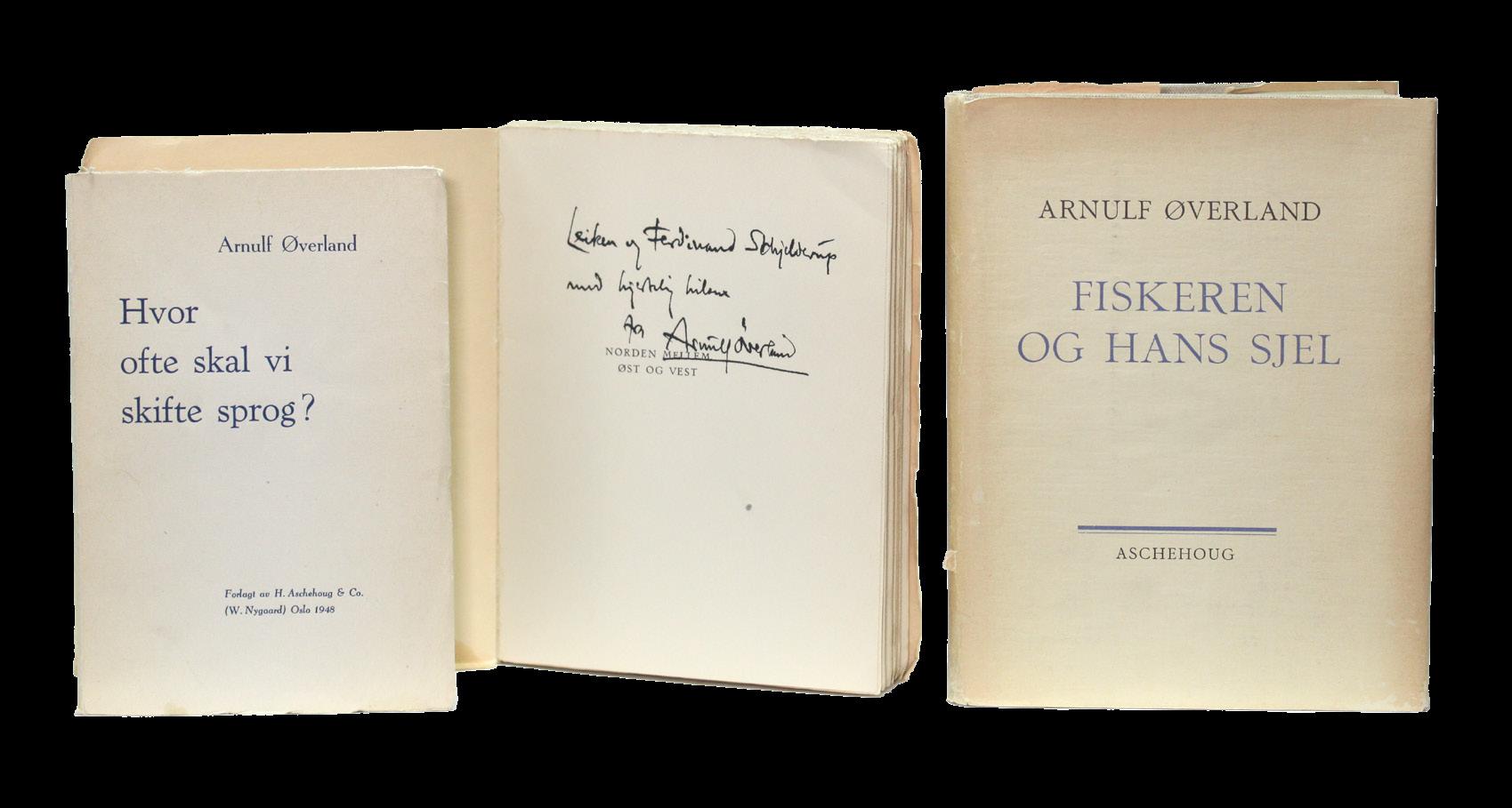 149 ØVERLAND, Arnulf: Hvor ofte skal vi skifte sprog? Oslo. 1948. 45 s. Originalomslag. Litt ufriskt omslag. Pen. Signert dedikasjon fra Øverland til jurist og fjellklatrer Ferdinand Schjelderup.(135766) 450,“Av historiske grunner som er kjent, hadde vi to sprog her i landet. To fullgode sprog med hver sin fullgode litteratur. Men to sprog var for meget, så derfor besluttet Stortinget at der skulde lages ett til. Nu har vi tre. Det tredje sprog har ingen litteratur, derfor kalles det bokmålet.”