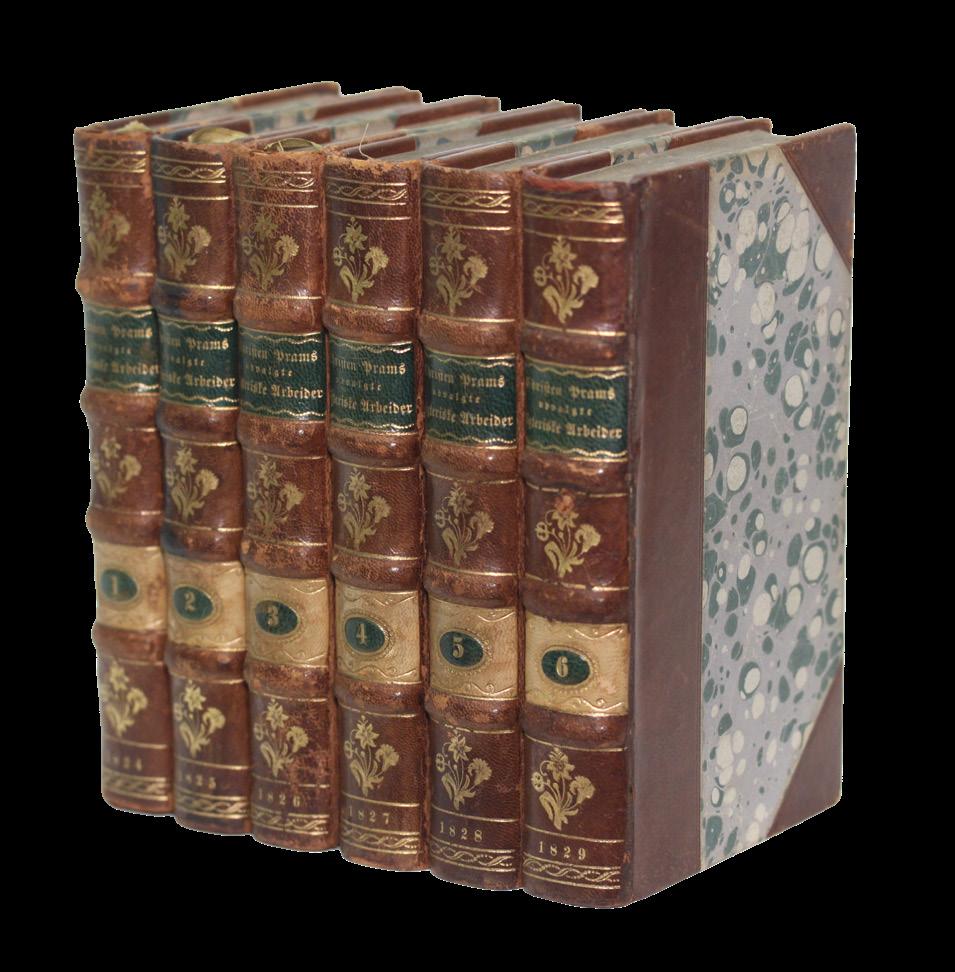 132 PRAM, Christen: Udvalgte digteriske Arbeider samlede og udgivne af K. L. Rahbek. Bind 1-6. København. 1824-1829. 8vo. Seks nyere elegante skinnbind i tidens stil med grønn og gul titteletikett og gulldekor på ryggene. Bindene jevnt noe slitte. Navnestempel (Knud Scavenius) i alle bind. Noen gulpletter i materien.(135767) 2.500,-