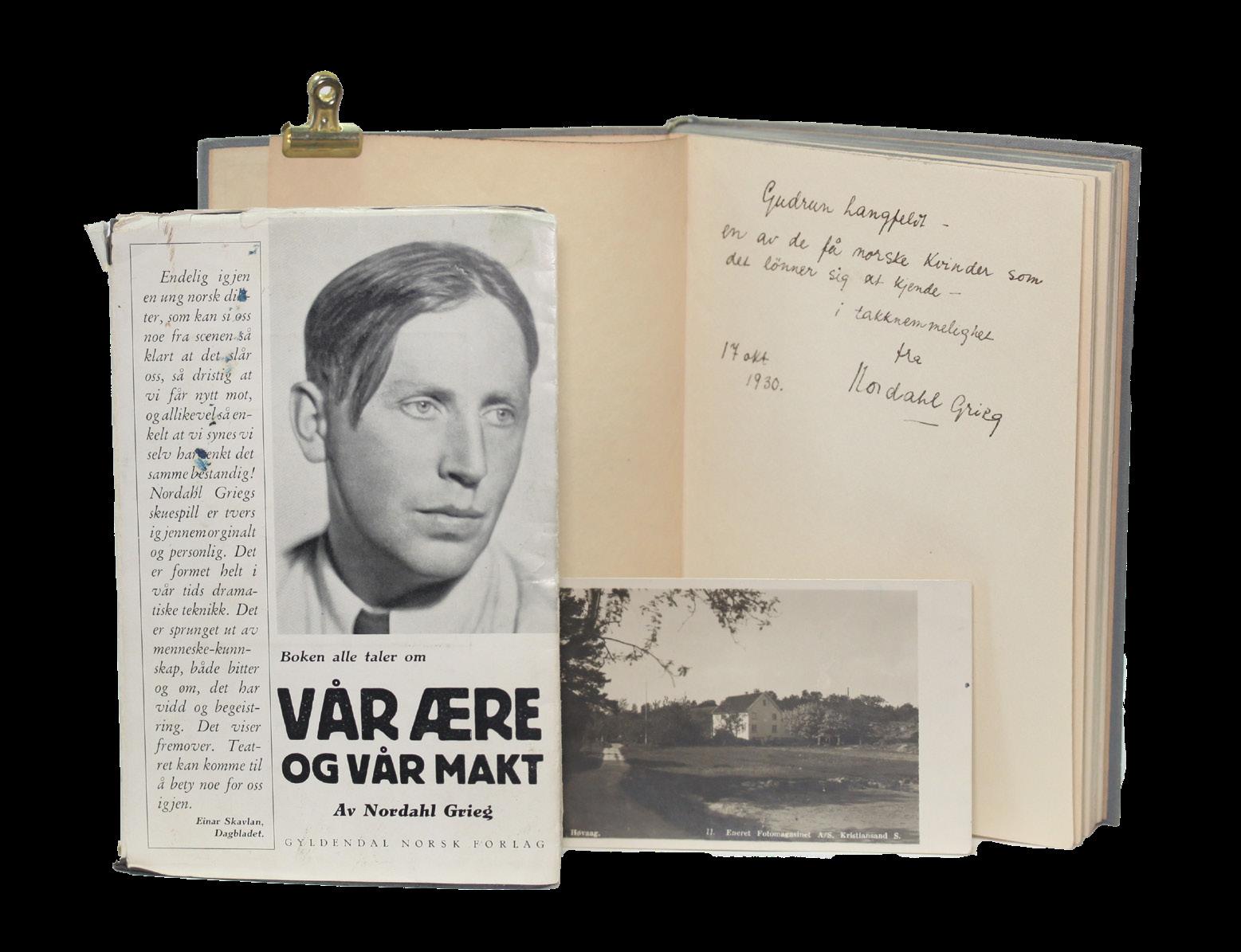 105 GRIEG, Nordahl: Vår ære og vår makt. Oslo. 1935. 8vo. 152 s. Sort orig. omsl. med orig. illustrert vareomslag. Rifter i omslaget. (135517) 2.500,Sjelden med vareomslag. Med fin dedikasjon: “Til professor Th. Thjøtta. Med takk for en replikk som jeg har lånt fra Dem. Deres ærbødige Nordahl Grieg, Nov 35”.