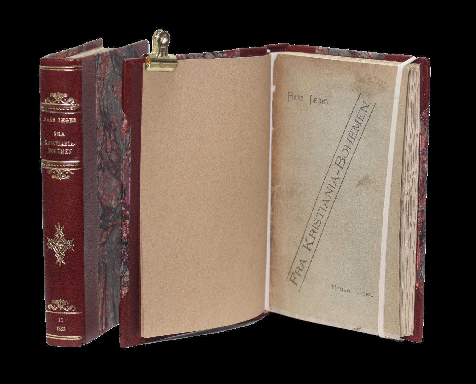 31 JÆGER, Henrik: Kristiania og Kristianienserne. Kristiania. 1890. 4to. 137 s. Med 12 fotografier i lystrykk, oppklebet på kartong. med rosa beskyttelsespapir. Orig. dekorert grått helsjirtingbind. Navn på tittelbladet, hilsen på tittelbl. (133003) 2.500,-