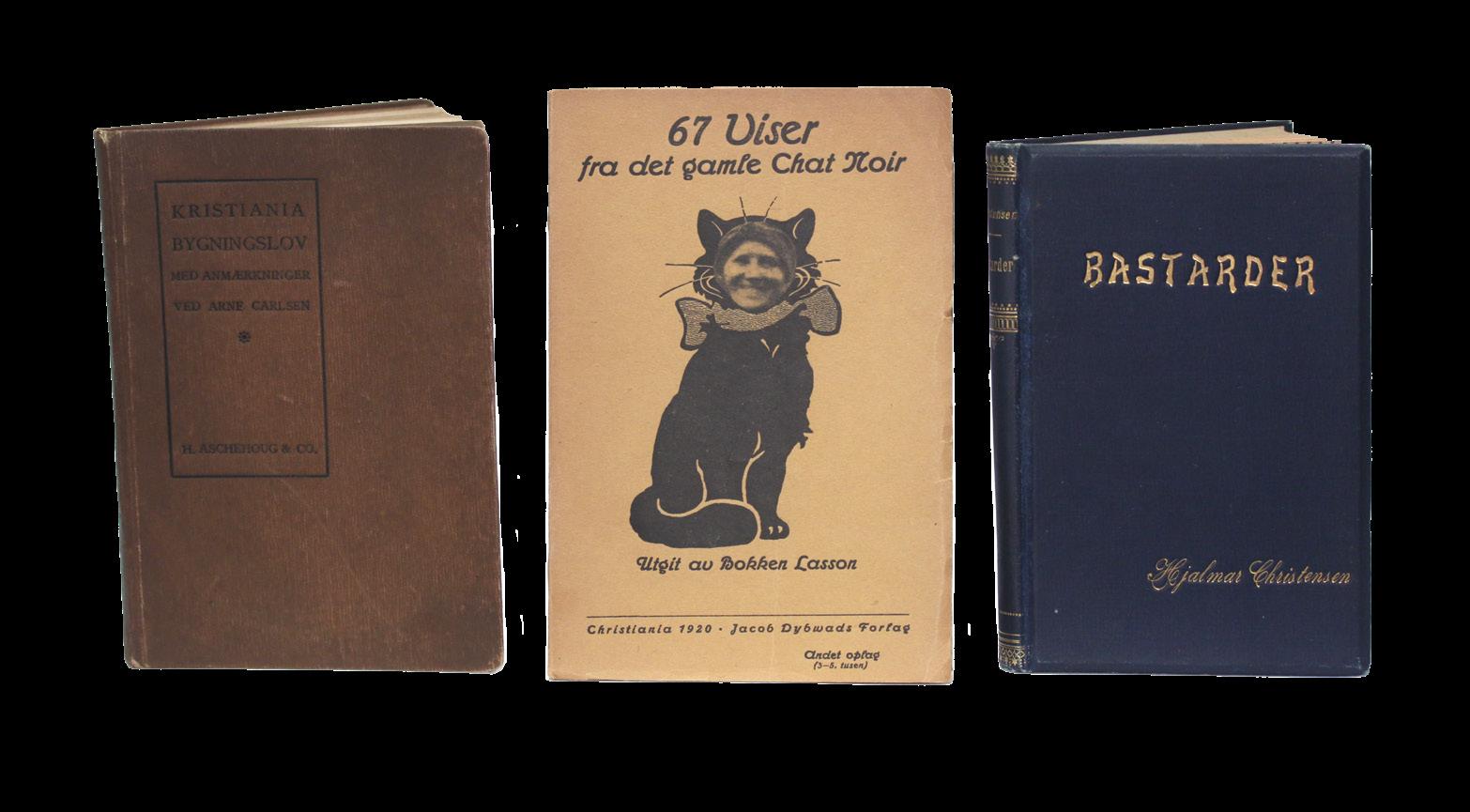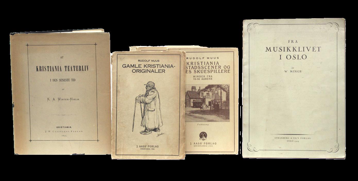 42 MUUS, Rudolf: Lott med 4 bøker: 1. Gamle Kristiania-originaler, 2. Gamle Kristianiaminder, 3. Kristiania forstadsscener og deres skuespillere, 4. Dikterliv i gamle Kristiania. Oslo. 1922-1932. 8vo. Fire orig. omslag. Noe slitte.(123883) 600,-