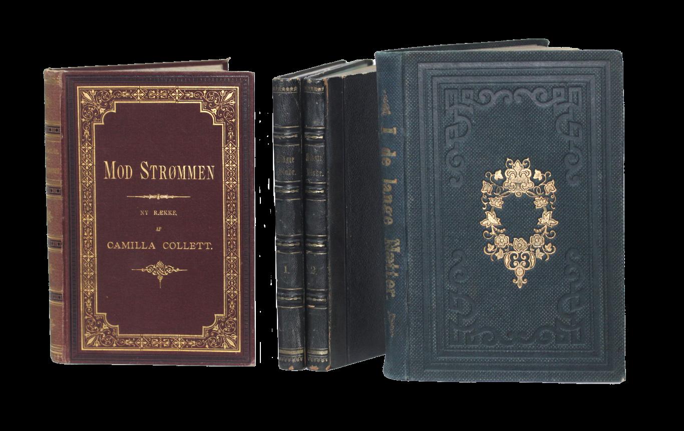 80 (COLLETT, Camilla): Mod Strømmen. Af forf. til “Amtmandens Døtre”. København. 1879. 8vo. (4), 282, (2) s. Fint samtidig skinnbd. med gulldekor på ryggen. Stilig overtrekk på permene. Svake gulpletter i materien.(135487) 800,-